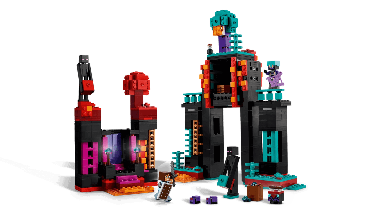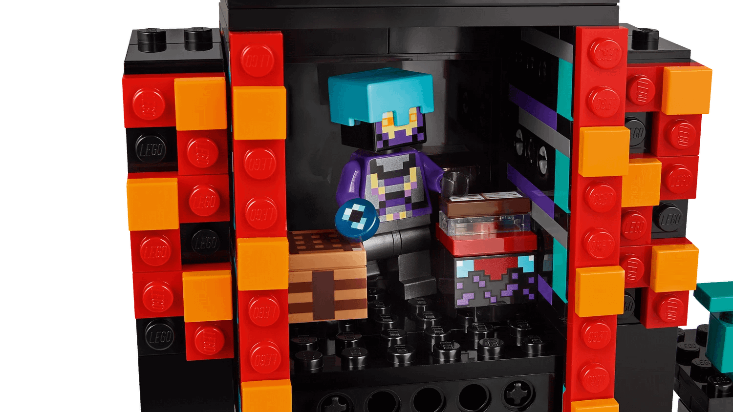 The primary build is an Enderman-shaped tower with a Nether portal in its head, a balcony on each shoulder and 2 rooms containing a crafting table, an enchanting table and a storage box for Ender pearls. Ladders provide access up the legs, the posable arms are fully articulated, and outside are elements of the warped forest and crimson forest biomes. The set features a Dimensional Defender, Realm Raider and 2 Enderman minifigures, plus 2 Endermite mob figures. Weapons include a Minecraft crossbow and netherite sword and shield. The Enderman Tower model can be rebuilt into 2 colour-coded fortresses, which is great for PvP (Player versus Player) action. Build with the LEGO® Builder app. Contains 867 pieces.