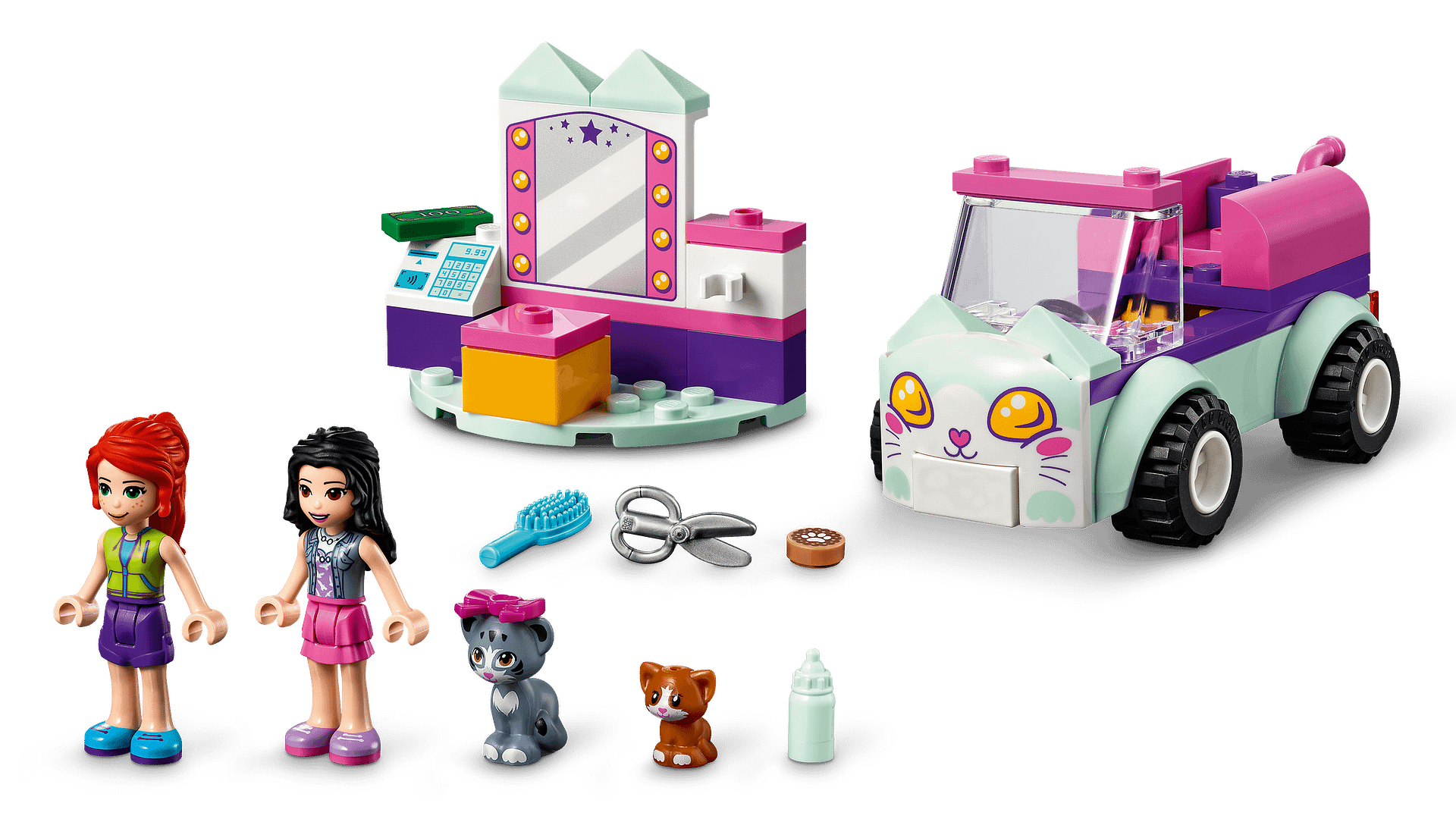 - Top-value Cat Grooming Car (41439) gets kids off the blocks and building as they have fun imagining collecting cats in a kitty-styled car and giving them a makeover at a salon.