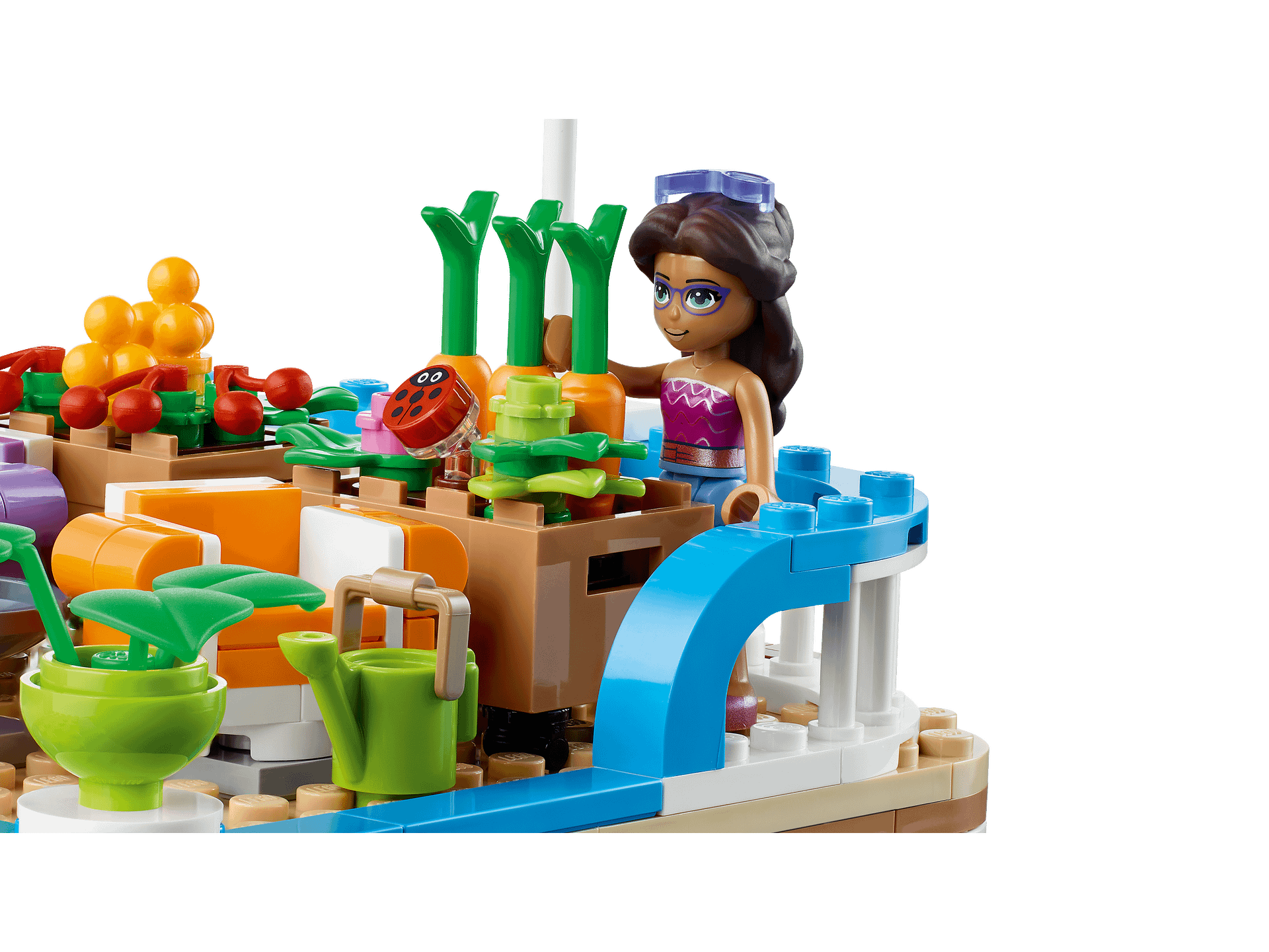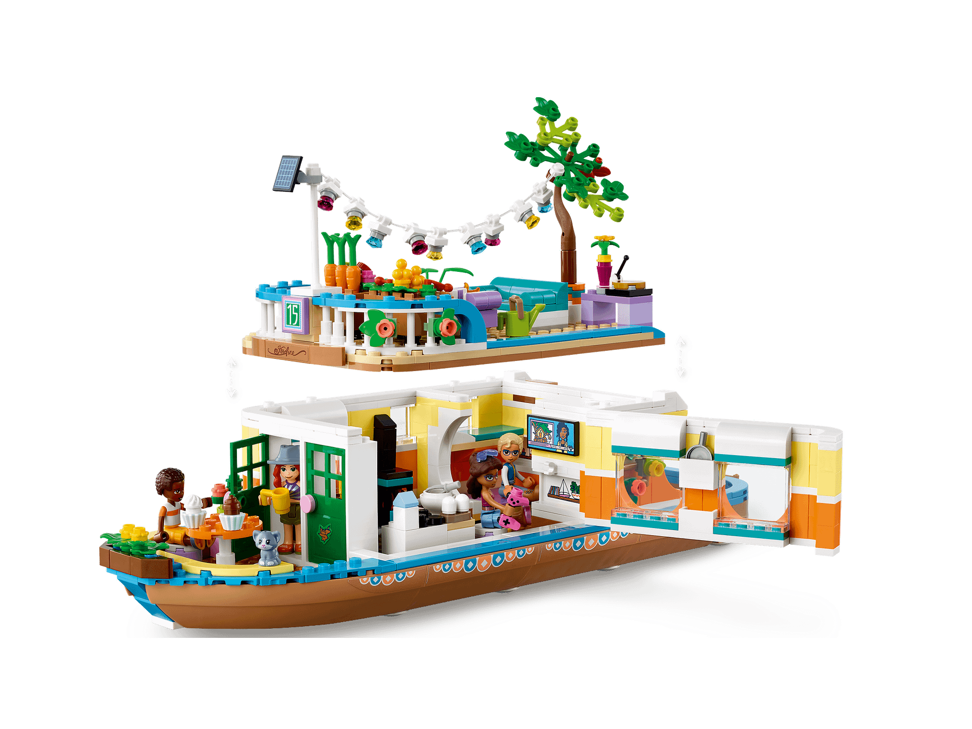- Retro-styled eco-houseboat model – Let kids live out an environmentally friendly lifestyle aboard the LEGO® Friends Canal Houseboat (41702), which comes with a deck-top market garden