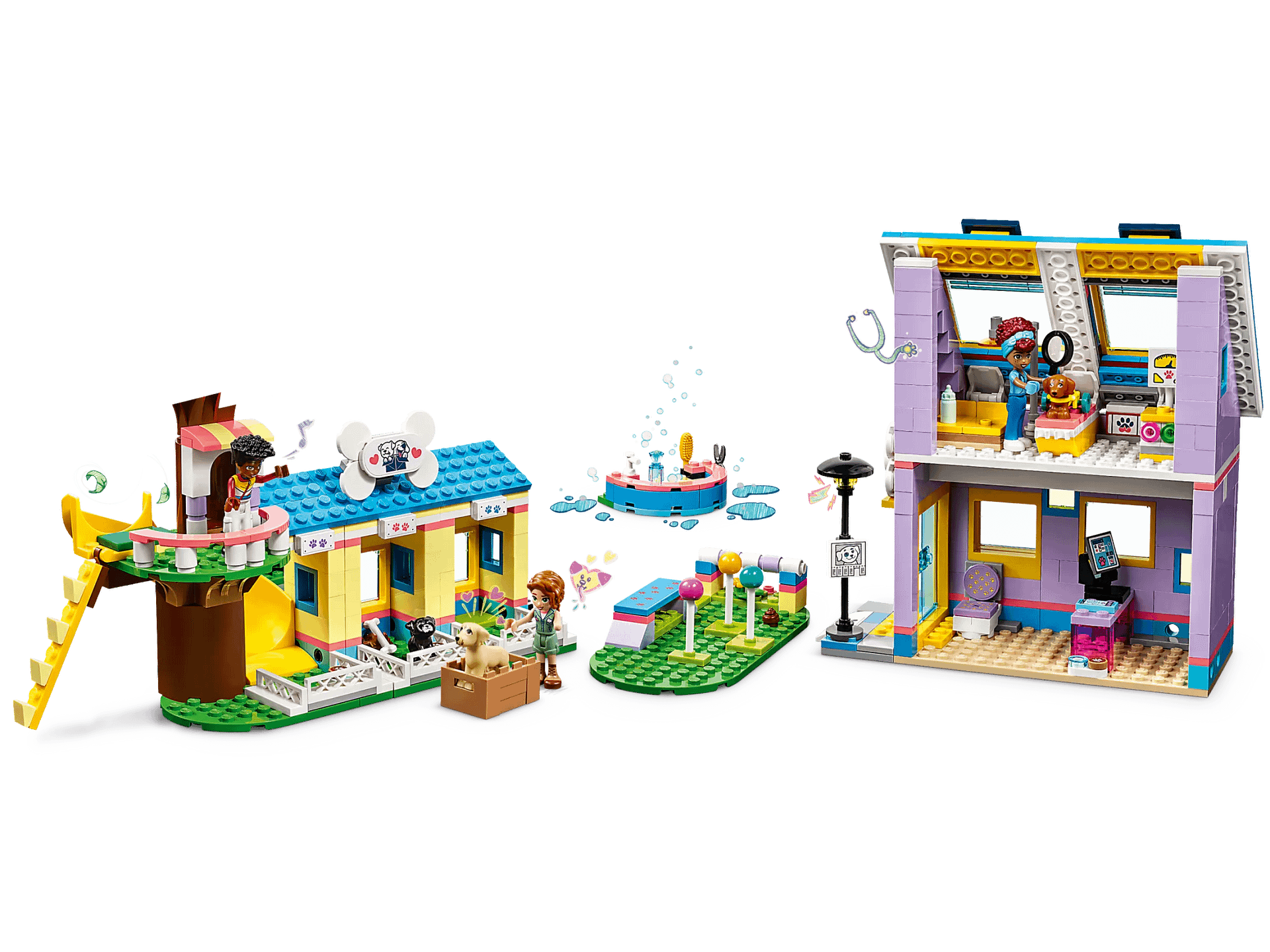 - Customize the build – Kids can build their own dog rescue center by rearranging the different areas, which include a reception area, treatment room, grooming station, obstacle course and kennels