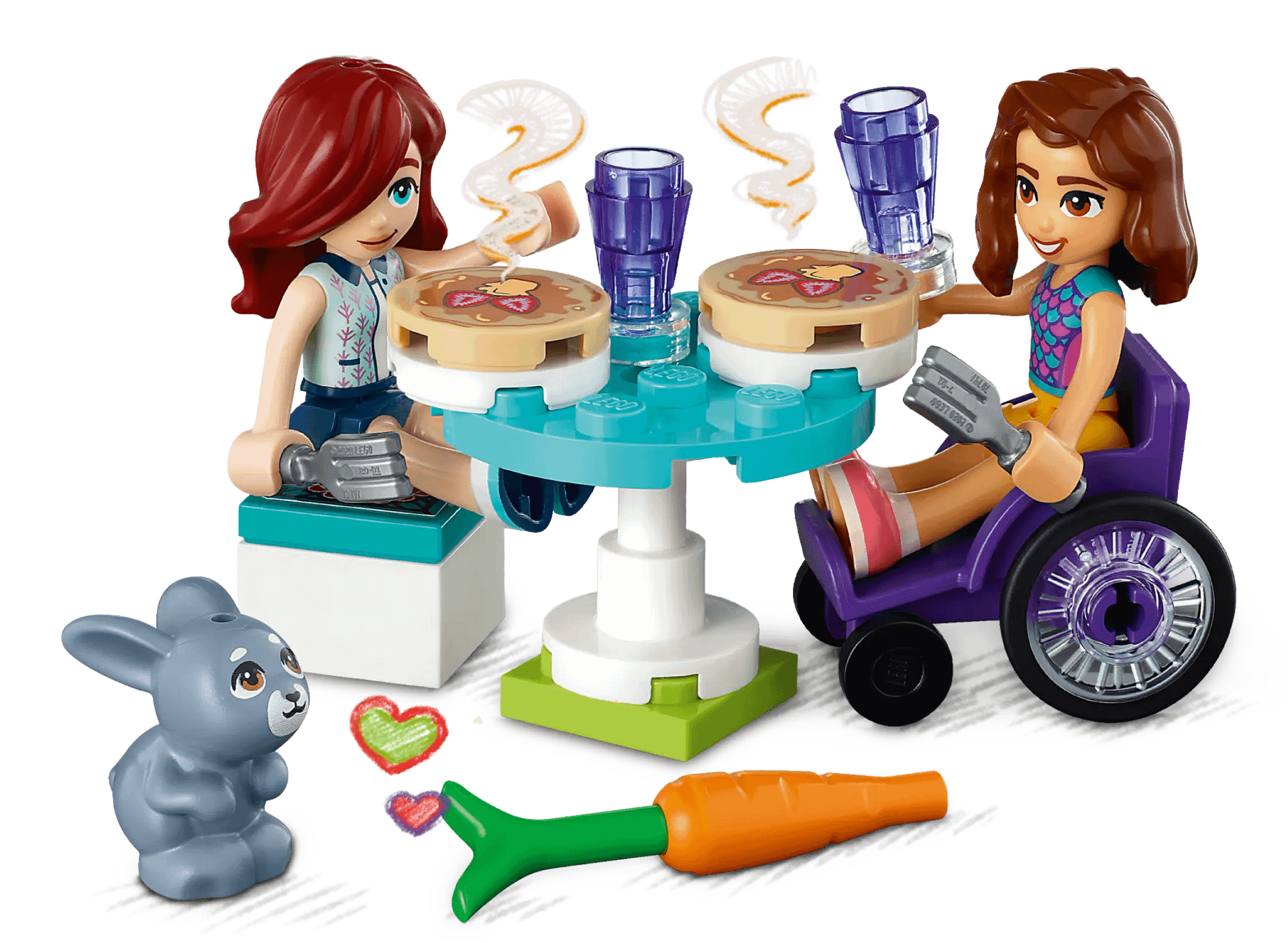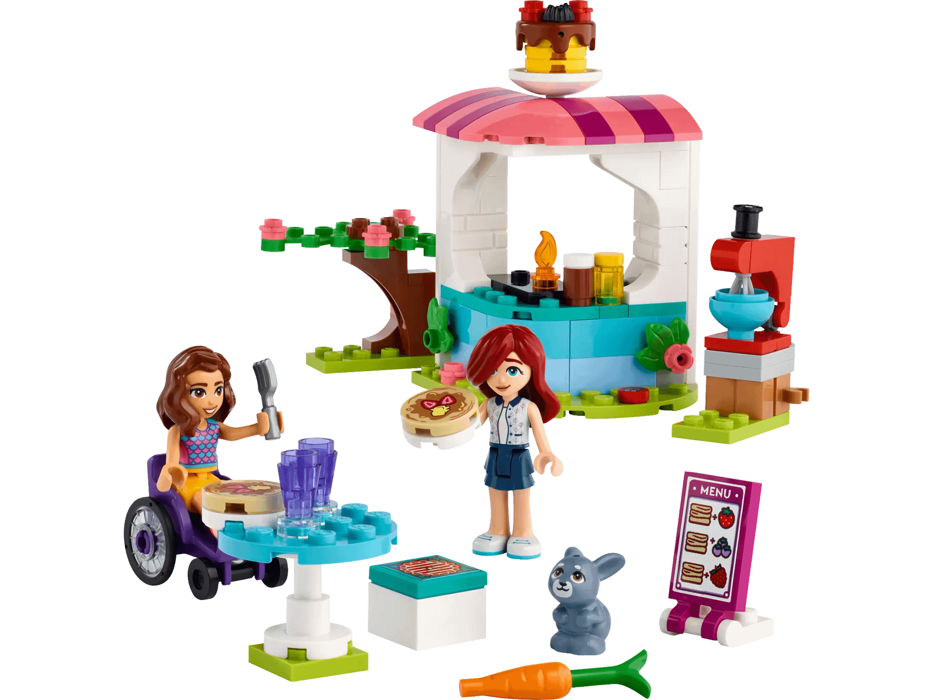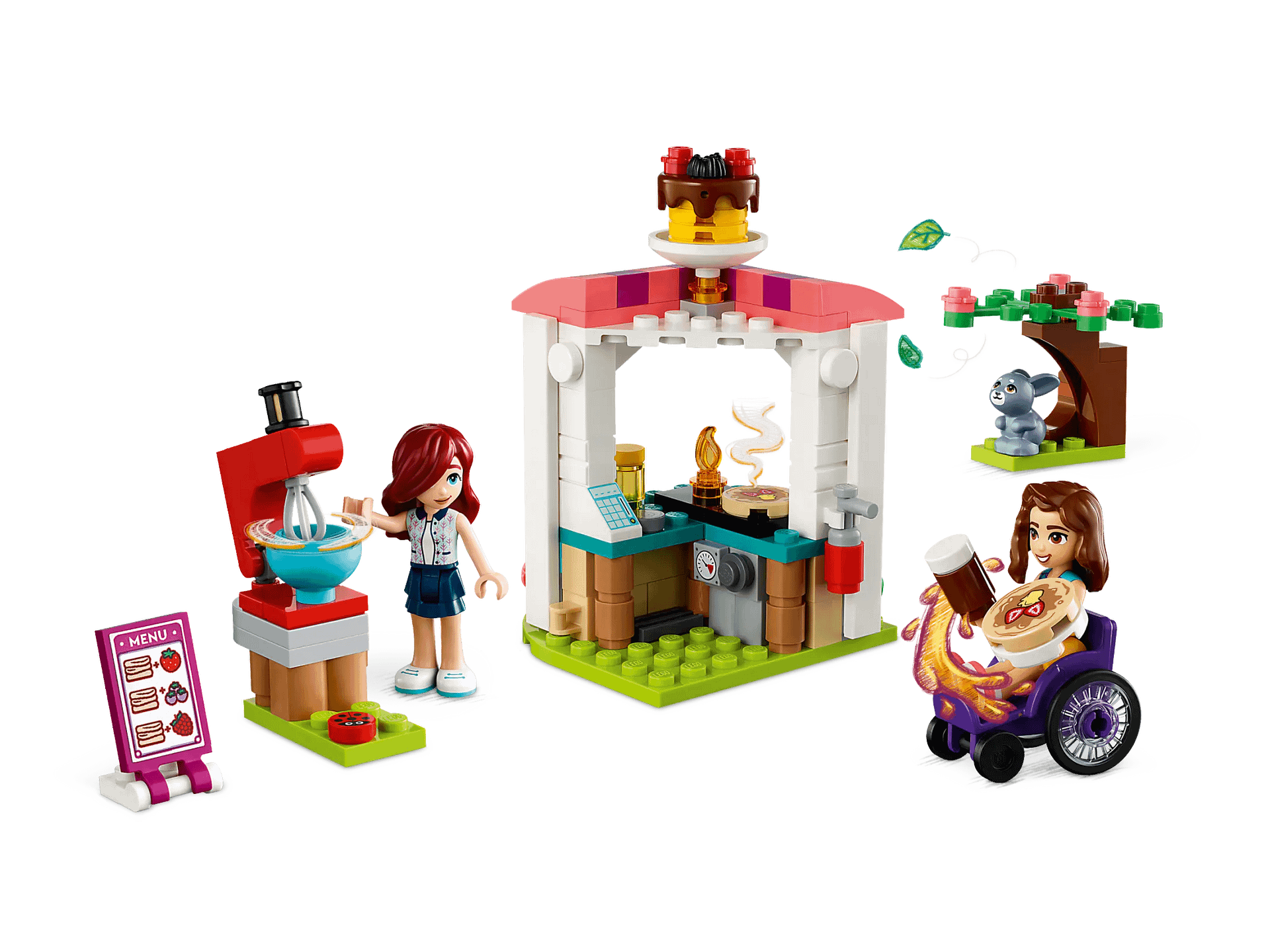 - Pancake-making accessories – This LEGO® Friends set includes a menu card, 2 pancakes, chocolate and honey cans, 2 forks, 2 cups, a fire extinguisher and a mixer