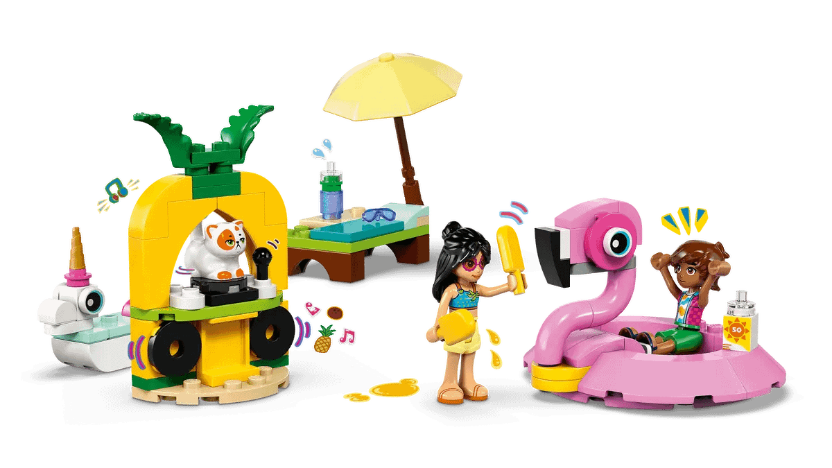 - 2 buildable floaties – Kids develop their building skills as they assemble the flamingo floatie, the unicorn floatie and the pool-side scene, which includes a lounge chair and a DJ booth
