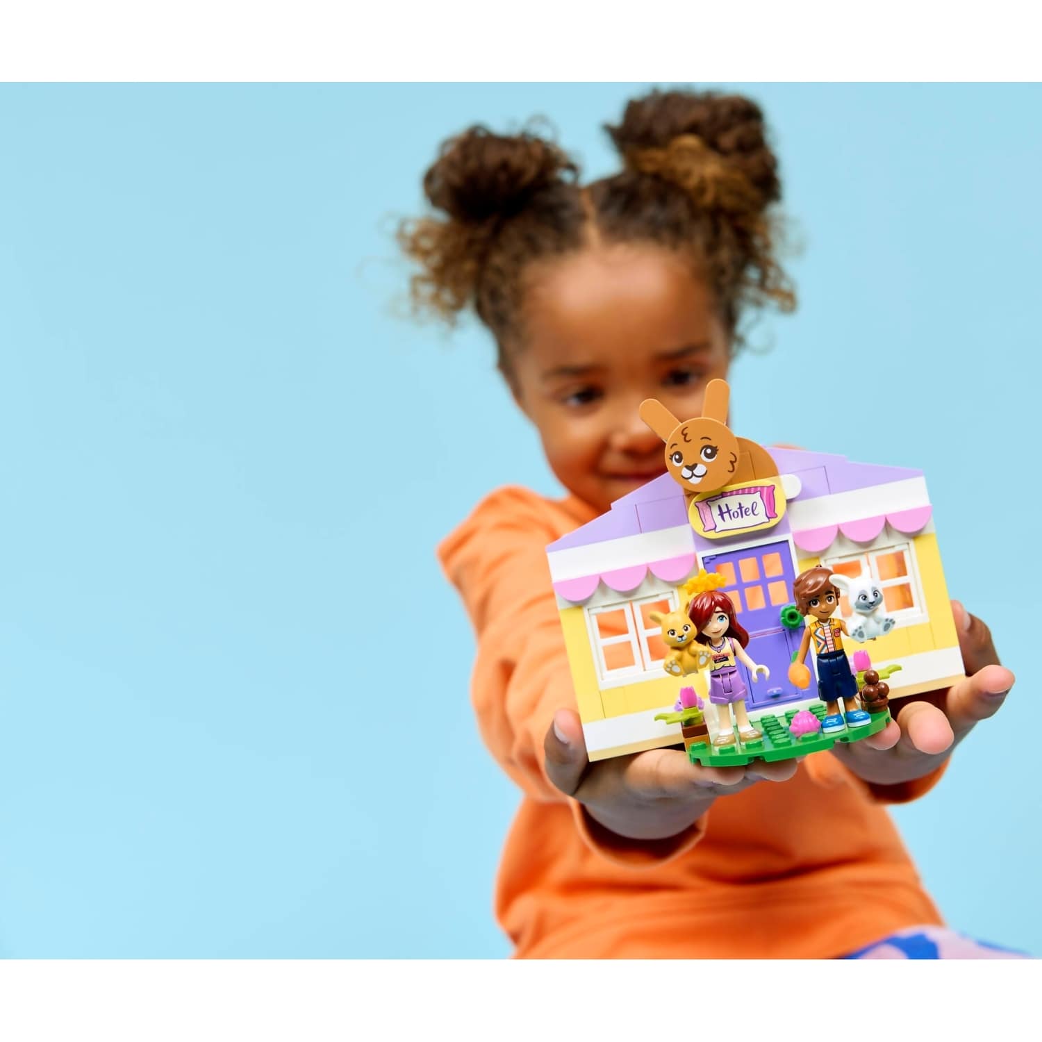 Hop into storytelling with this LEGO® Friends Heartlake City Bunny Hotel (42679) toy for girls and boys ages 5 years and up. This pretend play toy includes 2 minidolls and 2 toy bunnies, letting kids tell animal care stories. This cute set is packed with fun details, like the special pet door for the bunnies and the cute bunny sign.