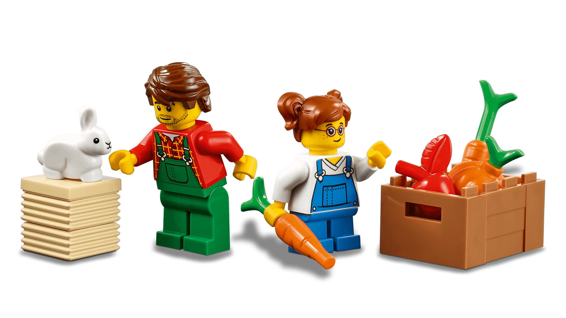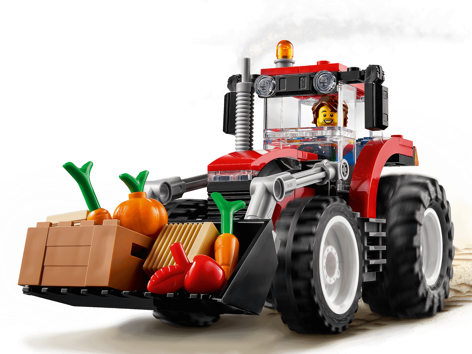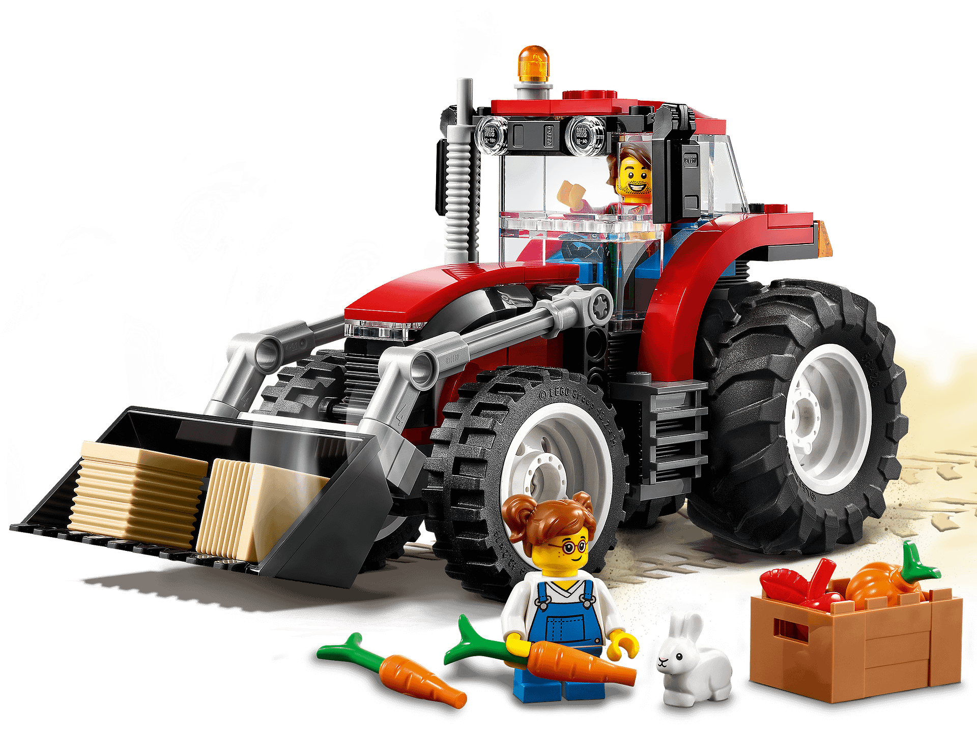 - Whats in the box? Everything kids need to create a cool toy tractor with lots of realistic features, plus 2 hay bales, a crate of veggie elements, farmer and daughter minifigures and a rabbit figure.