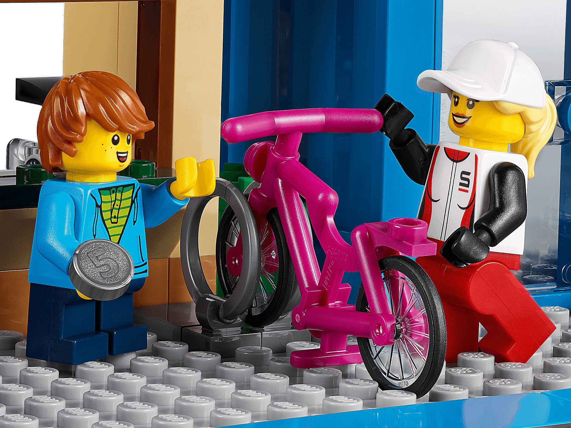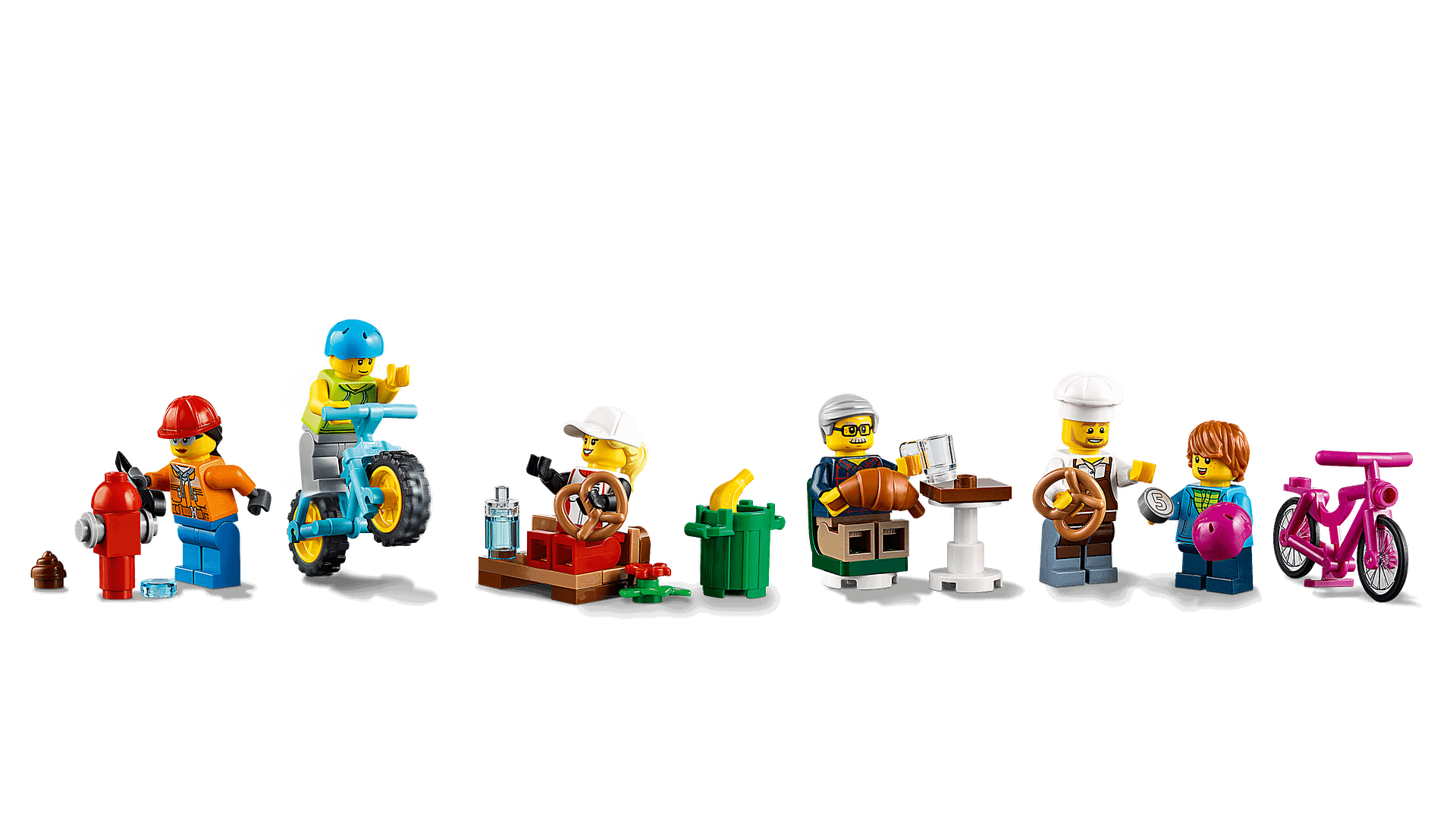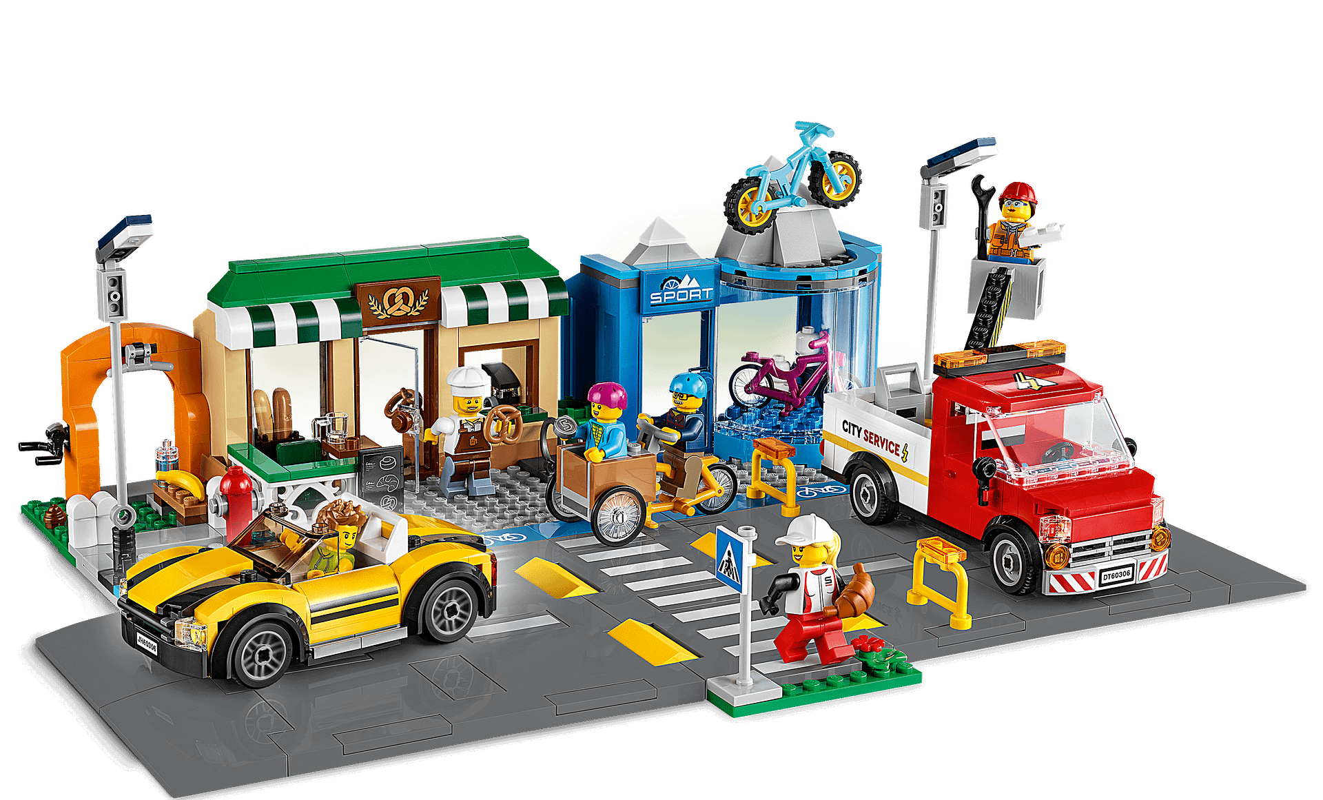 - Includes LEGO Road Plates with car and bike lanes and a crosswalk, plus a toy bakery, bike shop, outdoor training center, cargo bike, service truck with cherry picker, sports car and 6 minifigures.