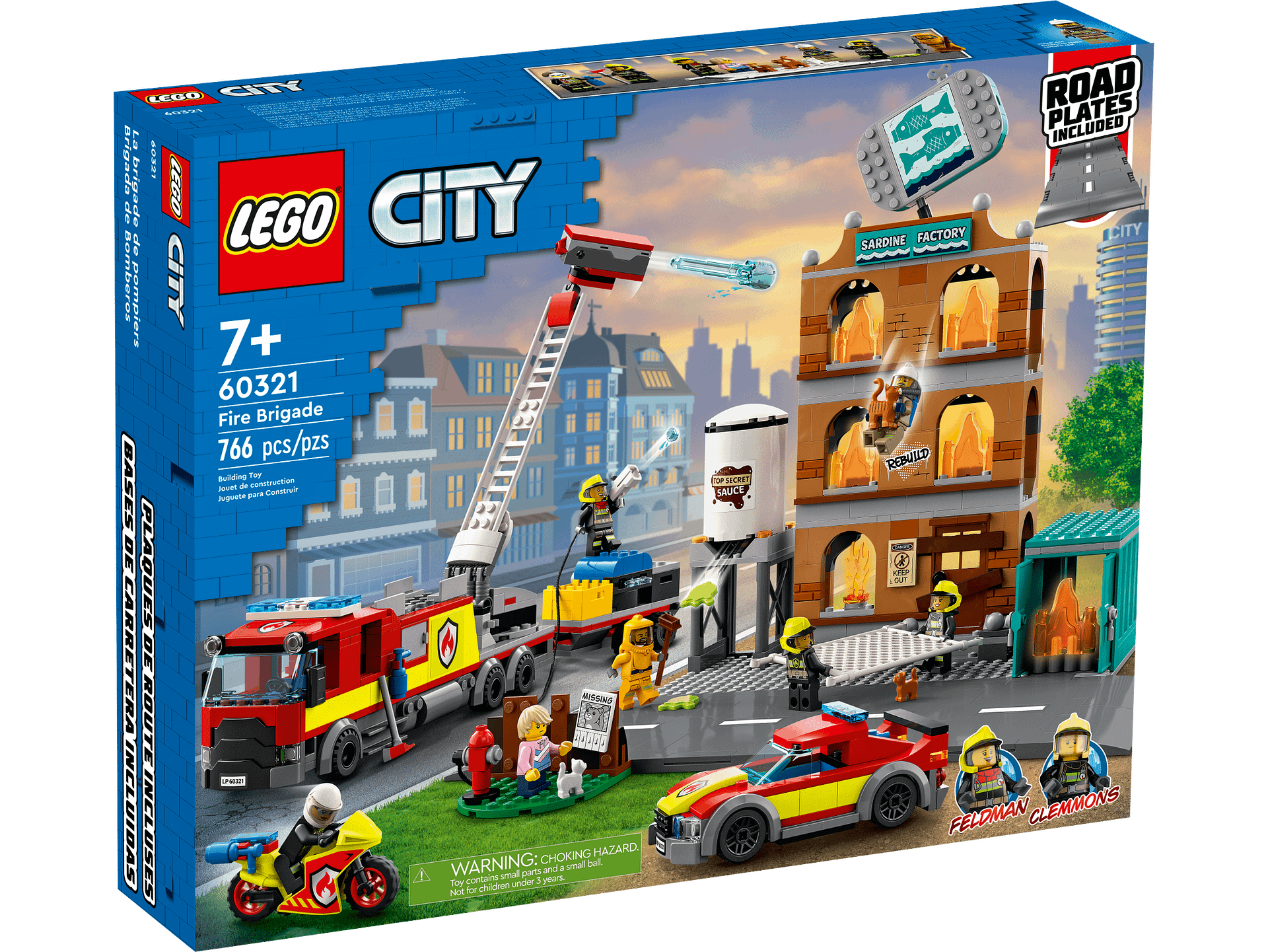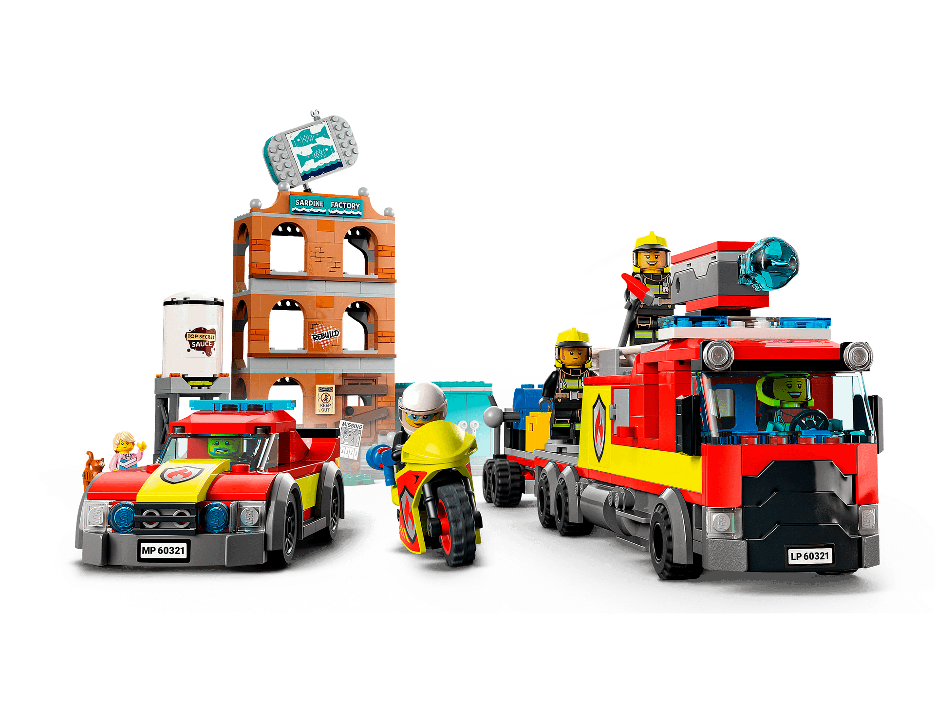 This LEGO® City Fire Brigade (60321) toy playset is packed with inspiration for imaginative play. Designed for ages 7 and up, it includes a 3-level sardine factory with fold-back LEGO flames and a ‘secret sauce’ vat, plus a firetruck and trailer that shoot water elements, a fire motorbike and a fire chief’s pickup. Add the kitten and cat figures and 7 minifigures, including 2 LEGO City TV characters, and let the play begin!