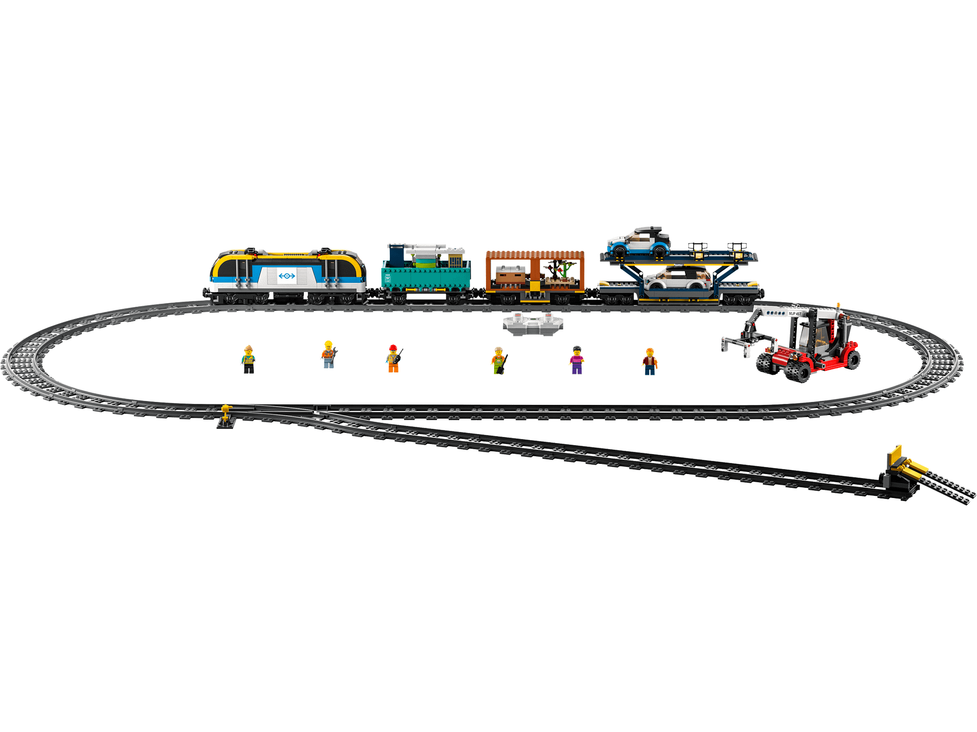 - What’s in the box? – Includes a locomotive, flatcar, open wagon, auto carrier, 2 EVs, toy charging station, 2 cargo containers, reach stacker, 33 track pieces and 6 minifigures