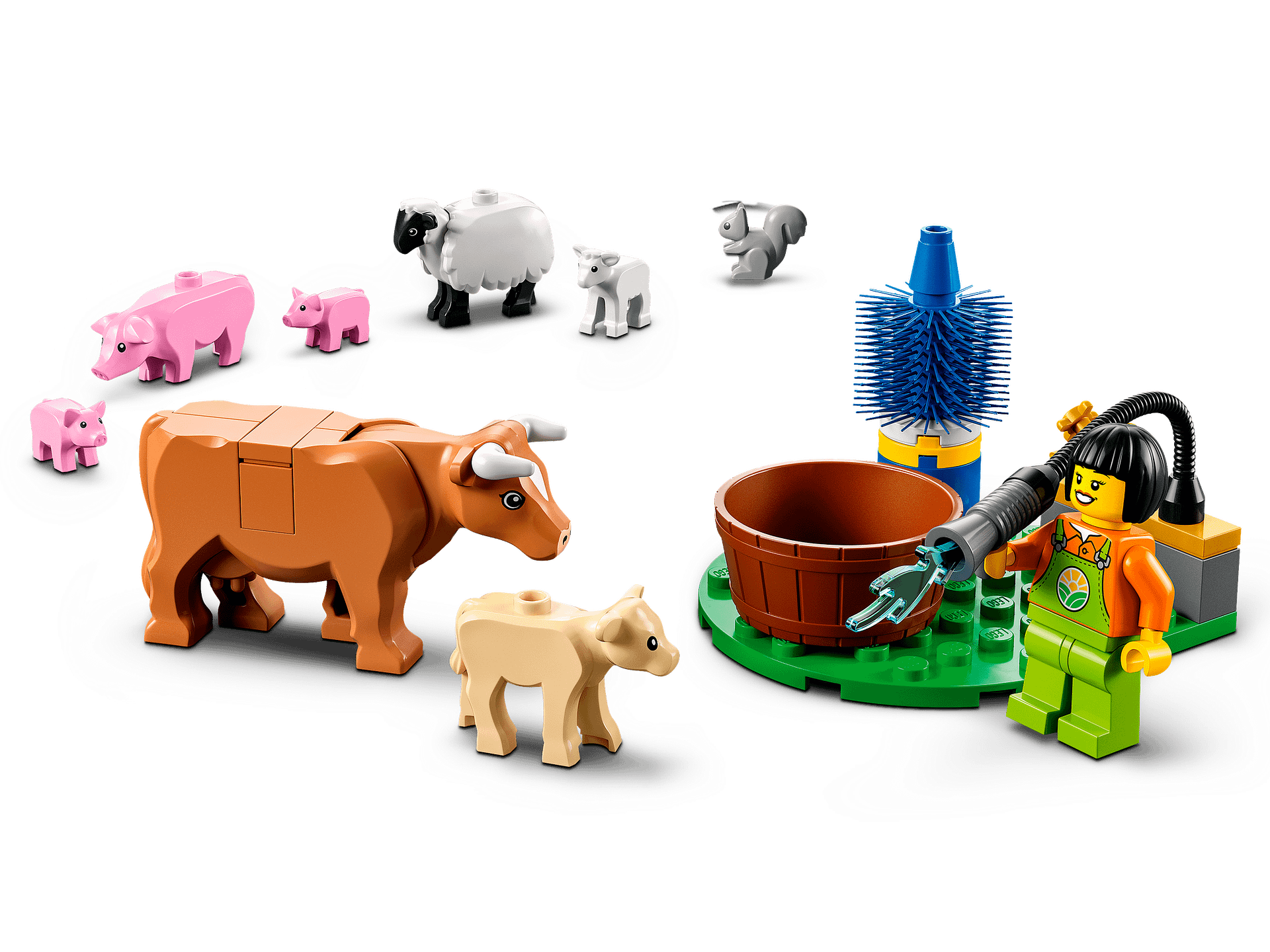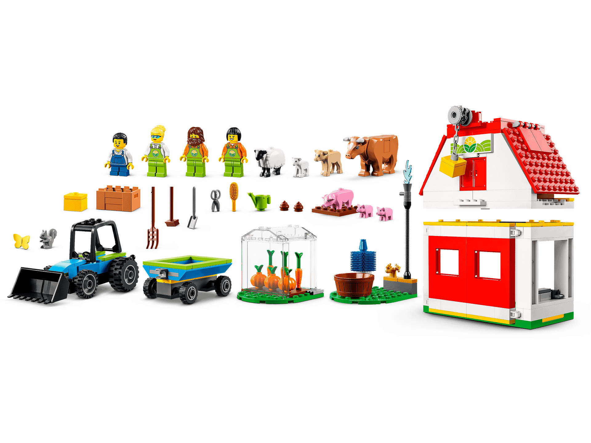 - What’s in the box? – All kids need to create a toy barn, greenhouse, tractor, trailer and 4 minifigures, including a LEGO® City TV character, plus squirrel, sheep, lamb, pig, piglet and cow figures
