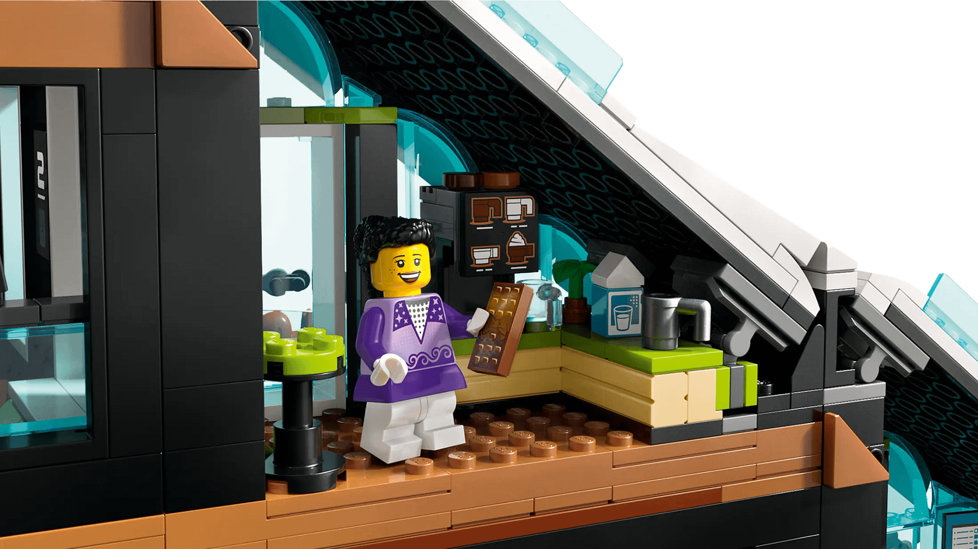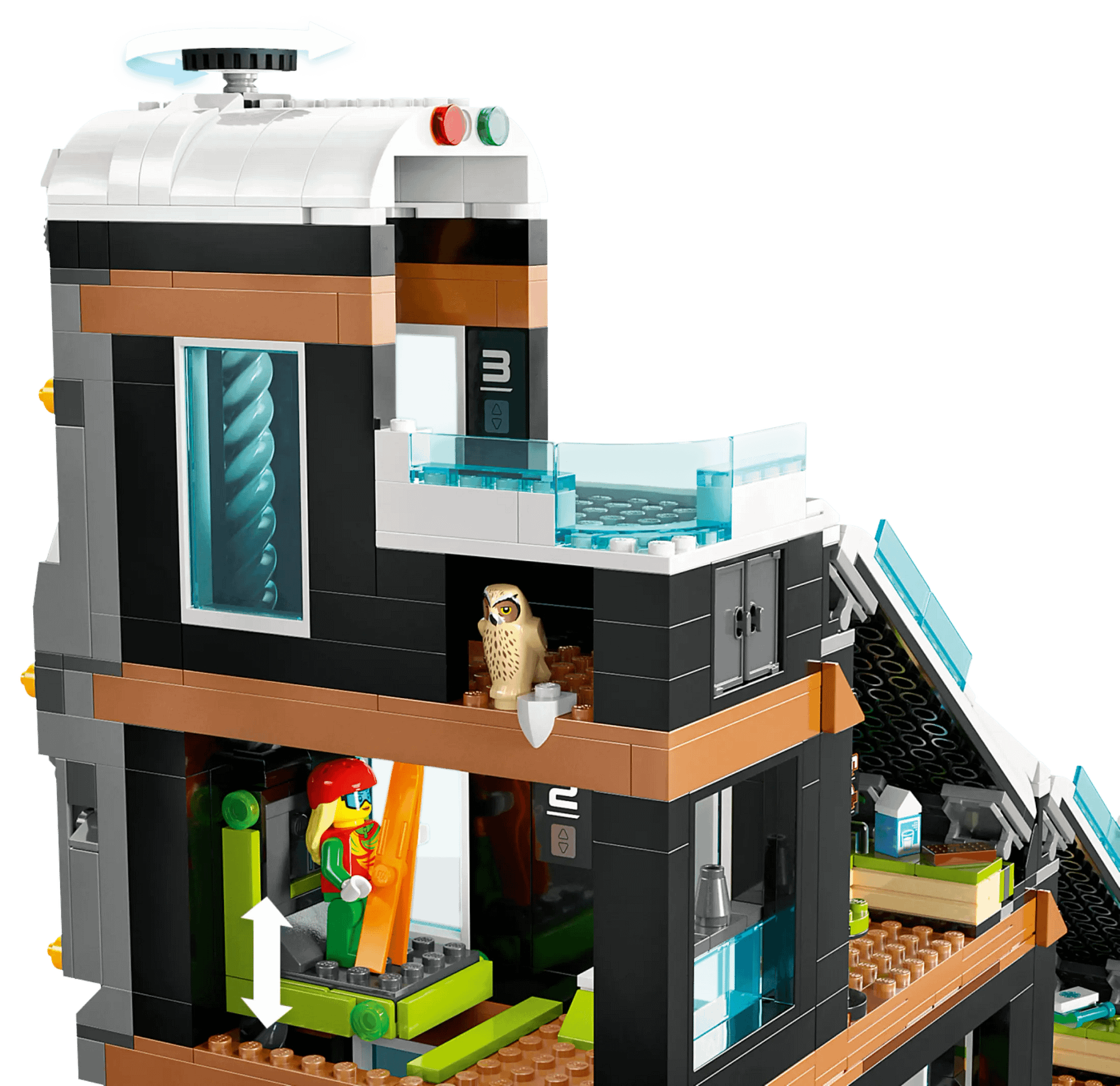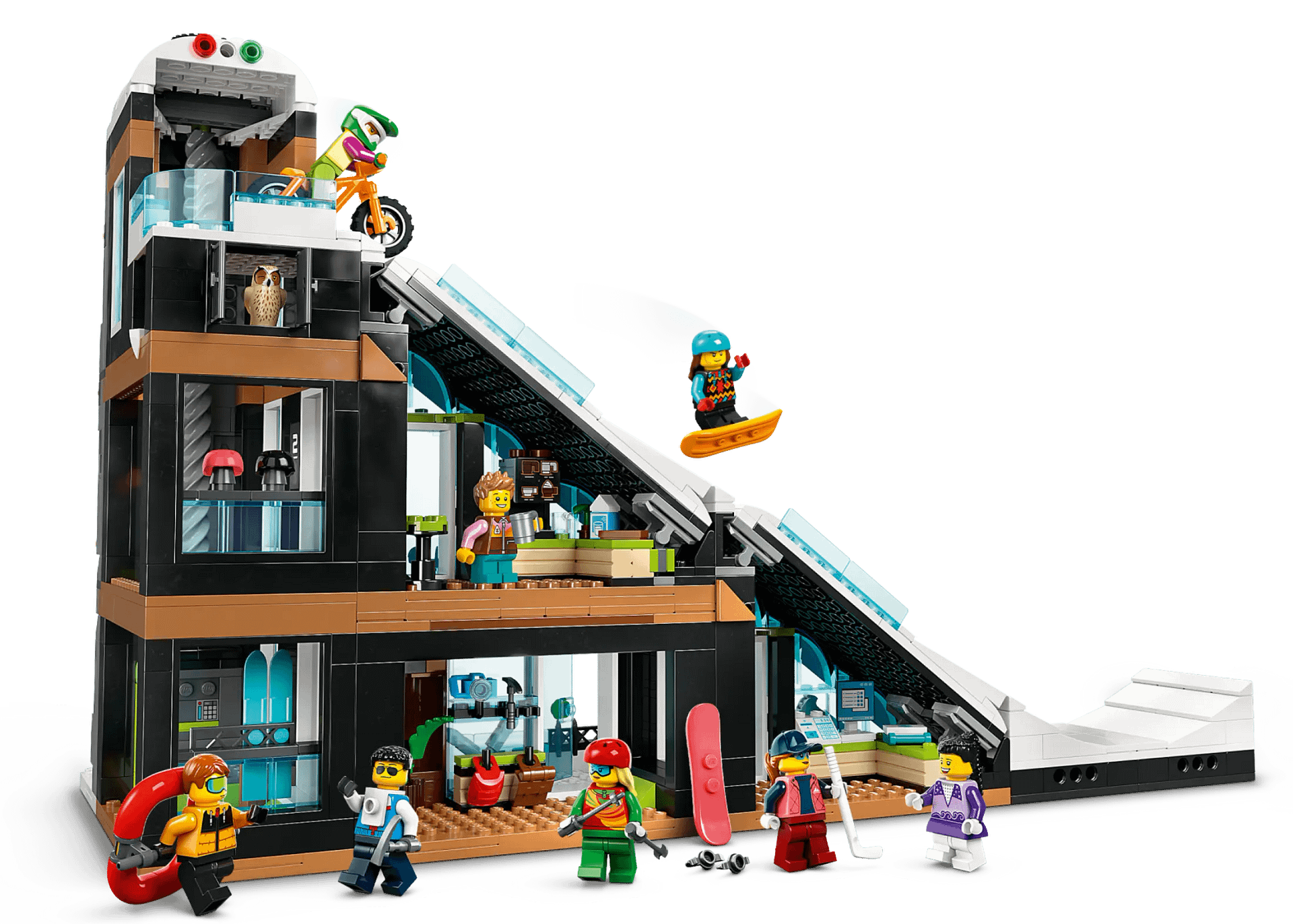 - What’s in the box? – Everything kids need to build a modular 3-level building with a winter sports shop, café and piste, plus 8 minifigures with ski accessories and snowman, owl and squirrel figures