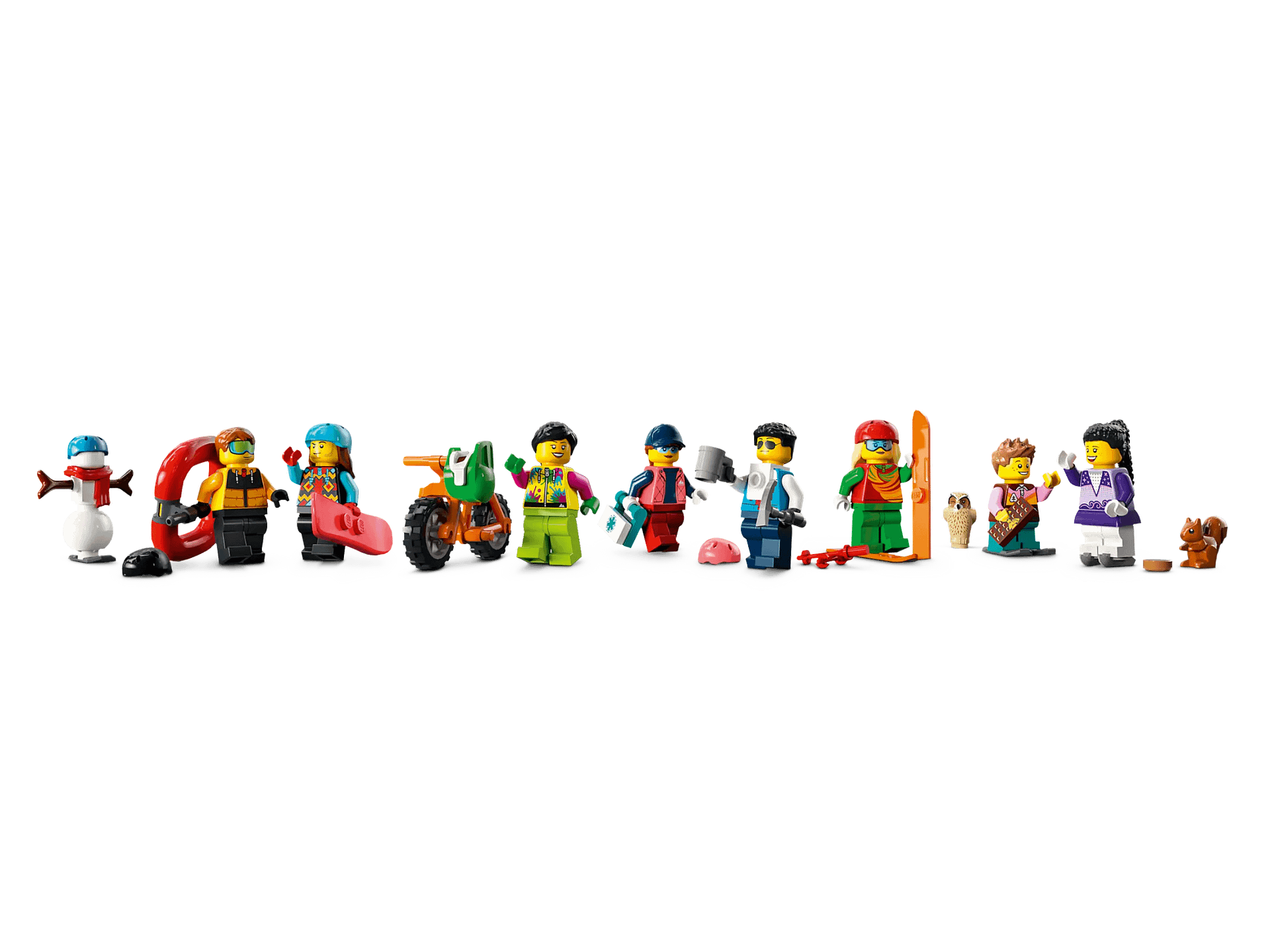 - LEGO® minifigure accessories – Toy accessories include a bicycle, medic pack, 2 backpacks, a camera, 4 skis, 2 snowboards, 4 snow poles, 2 ice hockey sticks, 4 ice skates, 4 snowshoes and 2 ice picks