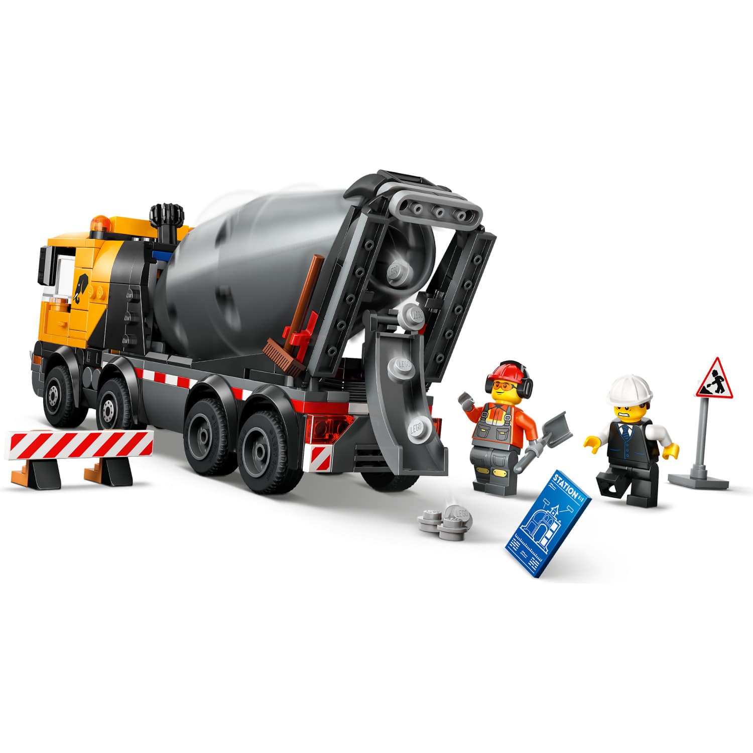 - LEGO® MINIFIGURE ACCESSORIES – This cement truck model comes with LEGO accessories including a wheelbarrow, road sign, 2 barriers, a clipboard, spade and broom