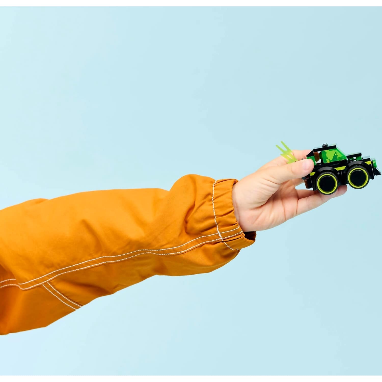 - MINI CAR FOR CREATIVE PLAY – Features an iconic neon-patterned gaming car design with oversized rubber tires, a driver’s cockpit and a flaming tailpipe for imaginative hands-on play