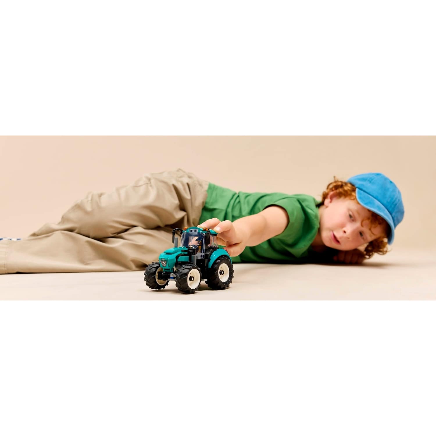 - WHAT'S IN THE BOX? – This LEGO® tractor set includes everything kids need to build a toy farm tractor with 4 large rubber tractor tires and a fresh teal color scheme, plus a farmer minifigure