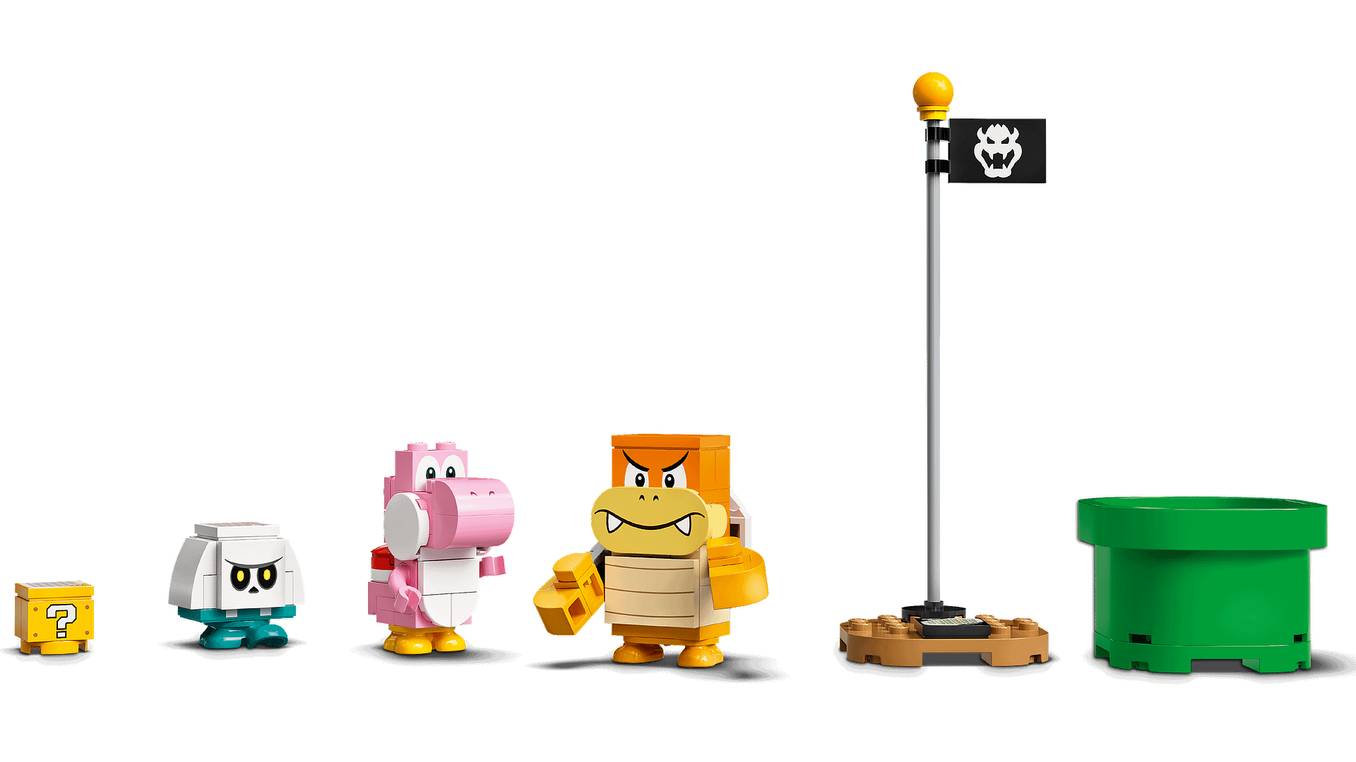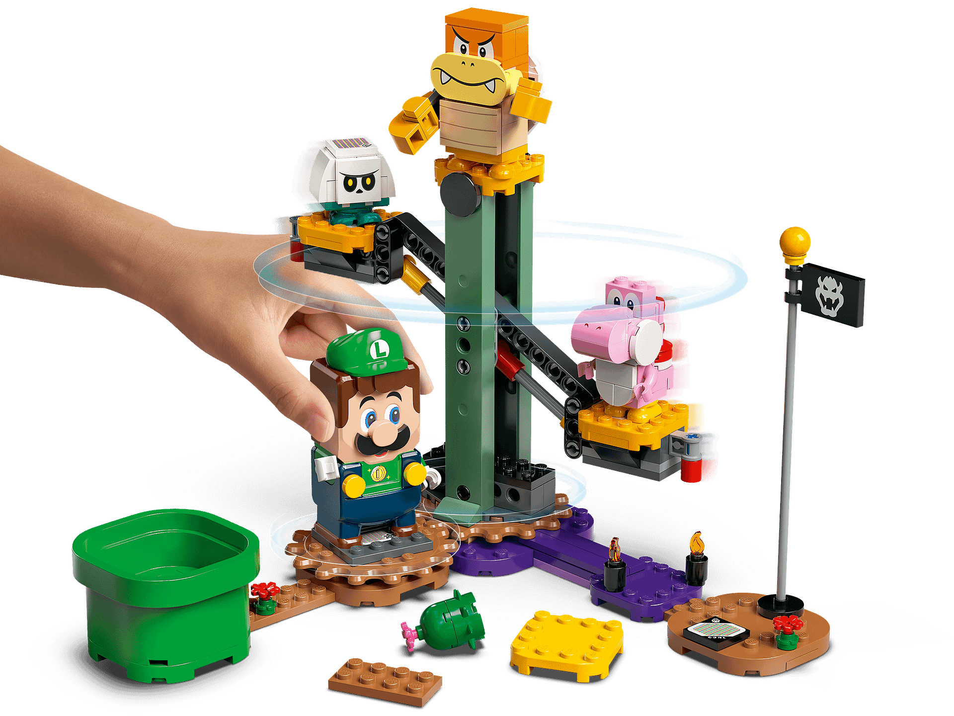 - Move LEGO® Luigi™ from Start Pipe to Goal Pole, collecting digital coins for spinning seesaw and flying challenges and interacting with the Block and Pink Yoshi, Boom Boom and Bone Goomba figures.
