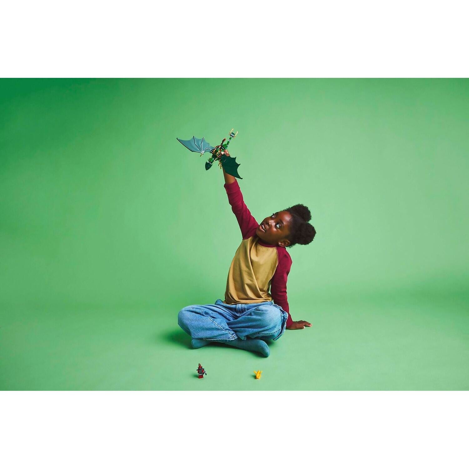 - Posable NINJAGO® dragon – A buildable model of Lloyd’s Green Forest Dragon with a posable tail, neck, legs, hands and large wings, plus a saddle so a minifigure character can ride on its back