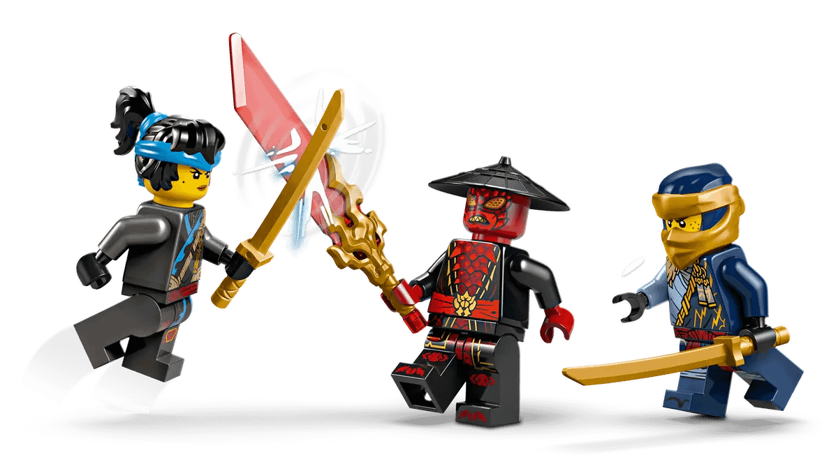 - Ninja weapon accessories – Role-play toy set includes Rogue and Nya characters armed with golden katana sword accessories and Drix with a translucent reveal blade accessory