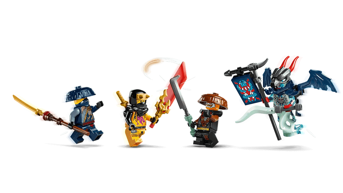 - 4 minifigures – Rogue, Arin, and the villainous duo Rox and a Spectral Dragonian Warrior who have a banner with a secret message that can only be read using Arin’s reveal blade accessory