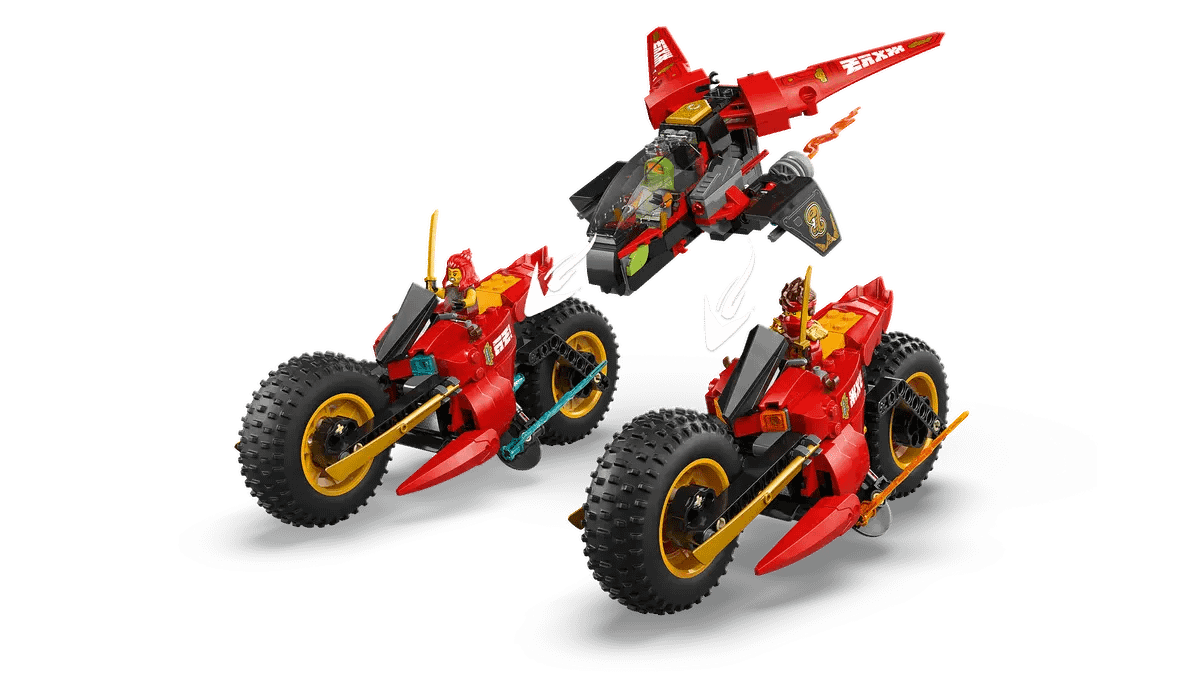 - Detachable ninja vehicles – The large NINJAGO® vehicle can be separated into 3 smaller vehicles: Kai’s ninja bike, Wyldfyre’s ninja bike and Frak’s aircraft jet toy with 2 stud shooters