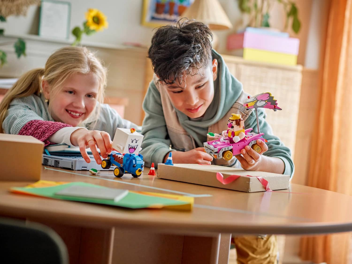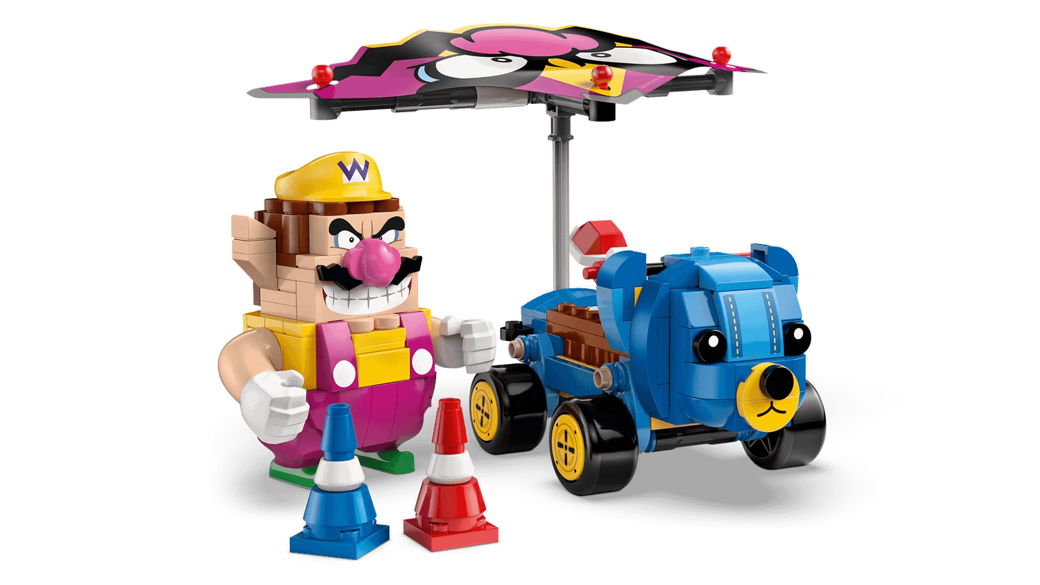 - Brick-built Mario Kart™ toy races – Team up with Wario in the Badwagon and King Boo in the Teddy Buggy for shell-launching battles, drifting and gliding fun and traffic-cone-swerving races