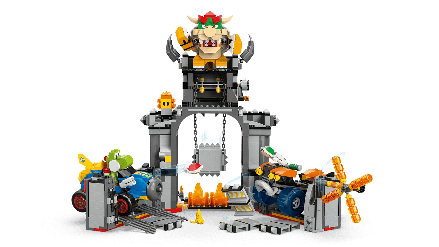 - Bowser’s Castle – Stage Bowser vs. Yoshi races, smash through walls and dodge the plunging Thwomp with this LEGO® Super Mario™: Mario Kart™ toy vehicle playset for kids