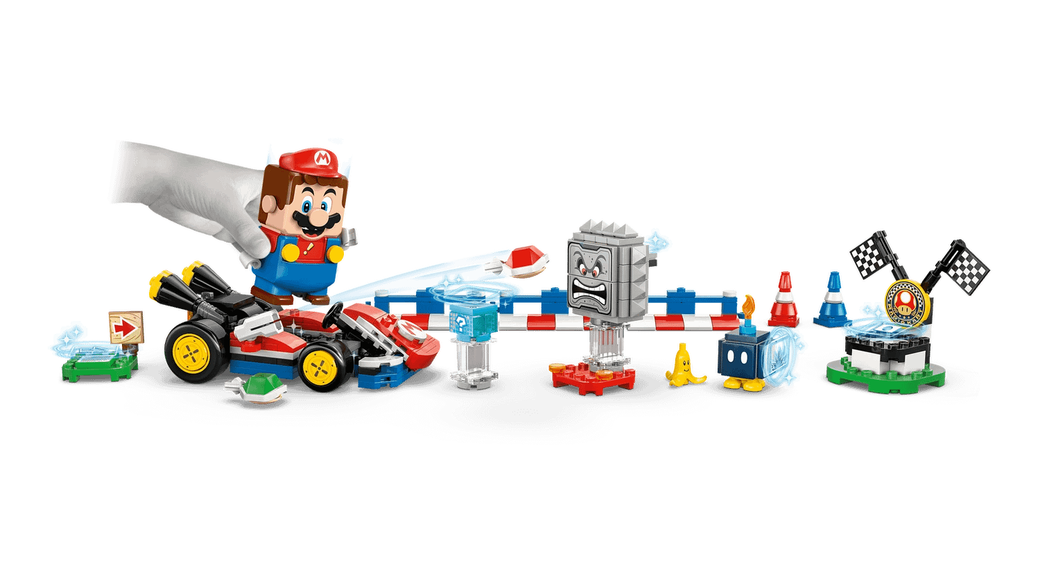 - Build and race – A Standard Kart, with drifting action and shell-launching function, an Item Box, 3 connectible track barriers, 2 traffic cones, and start area and winner’s circle with Action Tags
