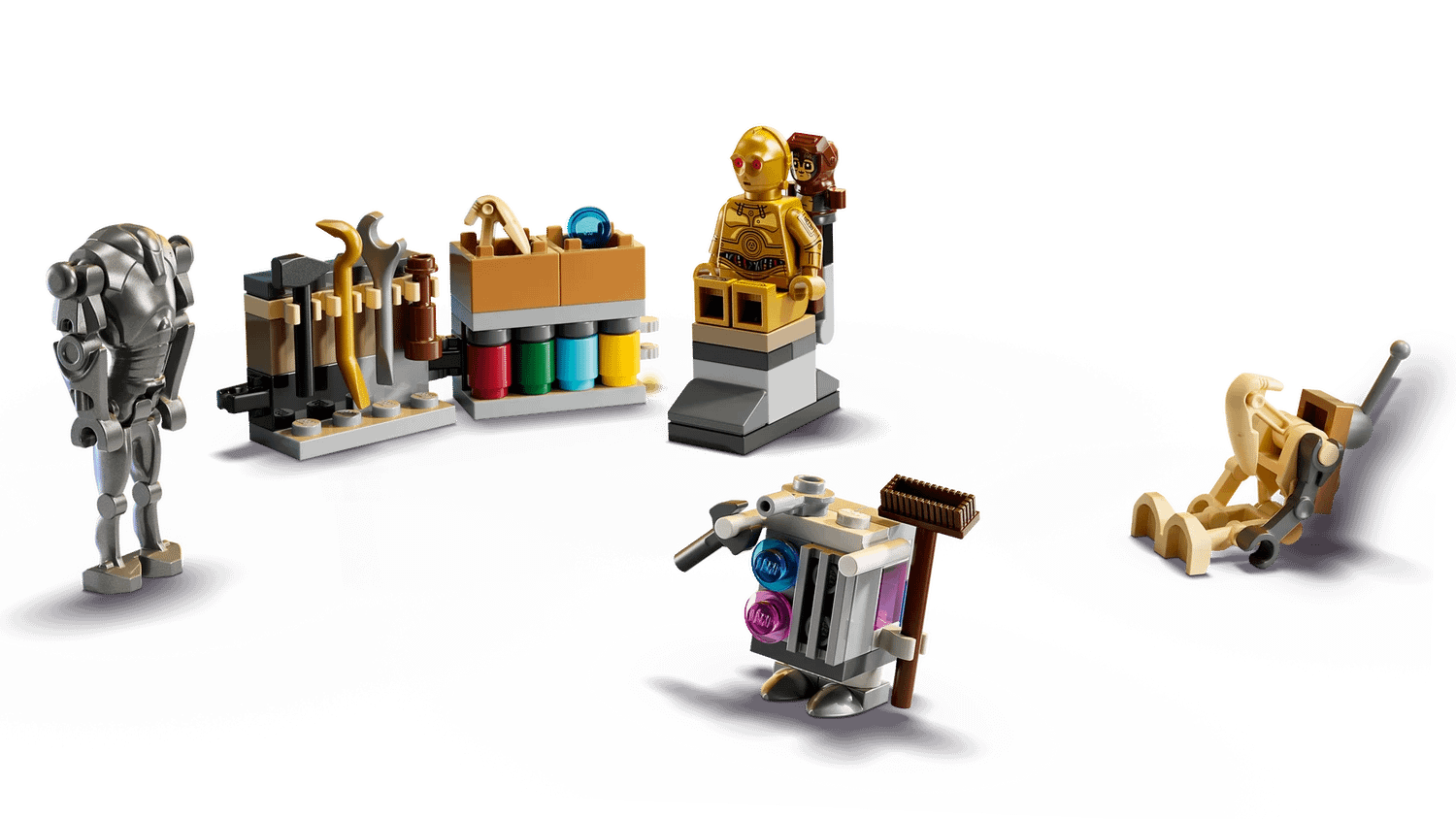 - 8 buildable LEGO® droids – A Pit Droid, Gonk Droid, Buzz Droid, Medical Droid (Holiday), B2EMO, Treadwell Droid, Mouse Droid (Holiday) and a Probe Droid