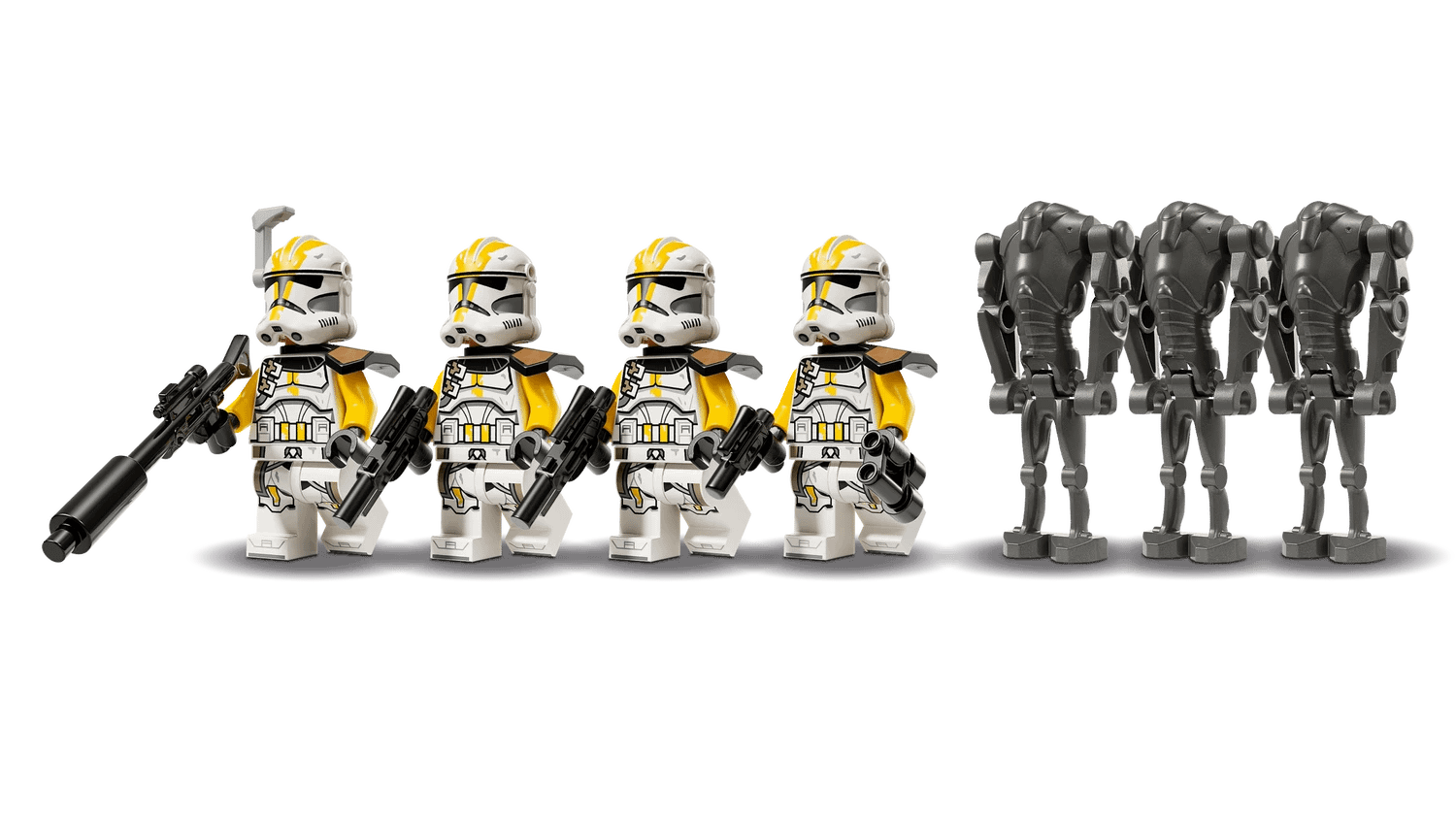 - 4 LEGO® Star Wars™ minifigures – 4 327th Clone Troopers with a blaster pistol, 2 blasters and a blaster rifle, plus 3 Super Battle Droid LEGO figures