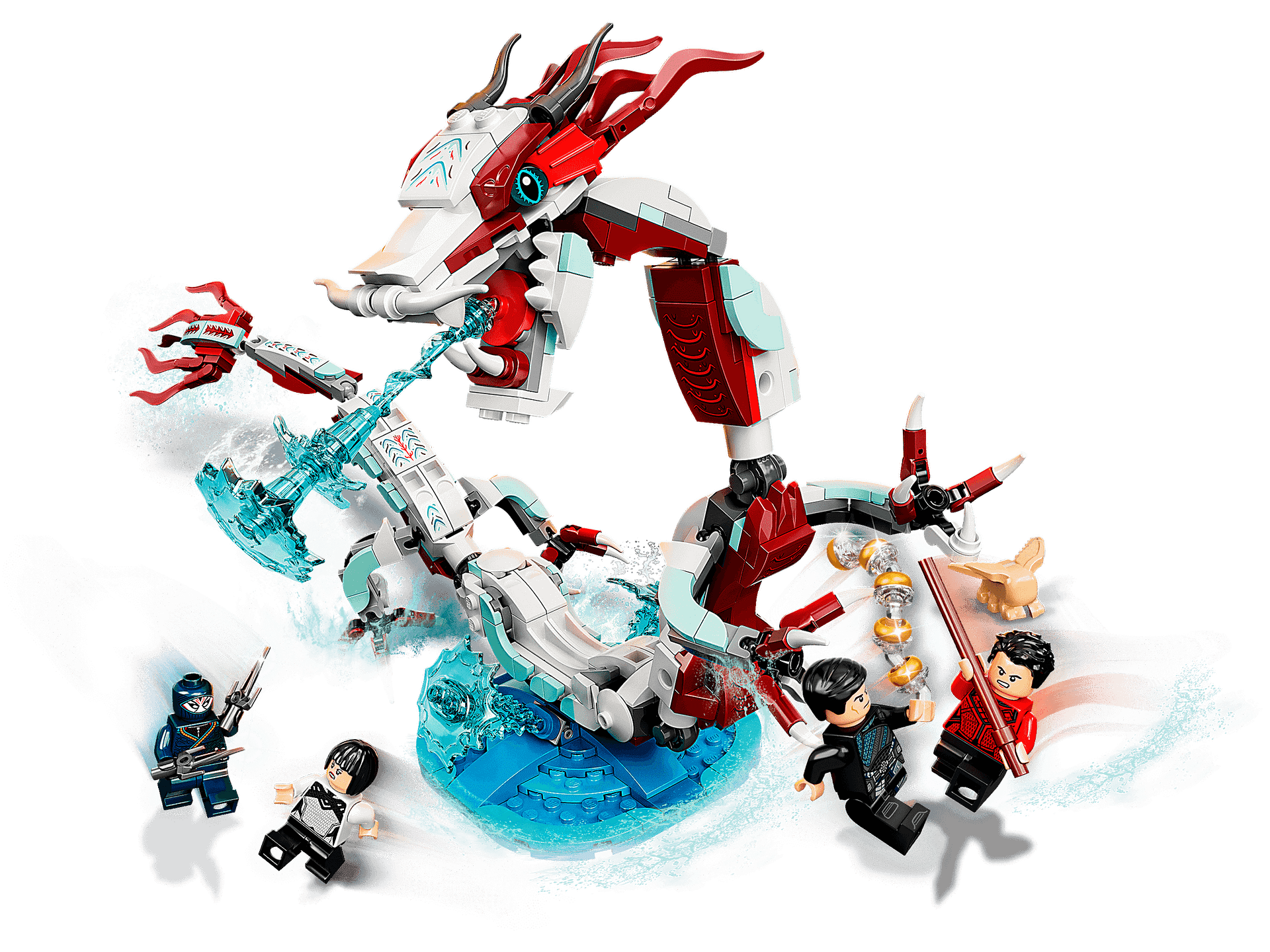 - Includes 4 minifigures – Shang-Chi, Xialing, Wenwu and Death Dealer – and a buildable, articulated dragon with a detachable water base.