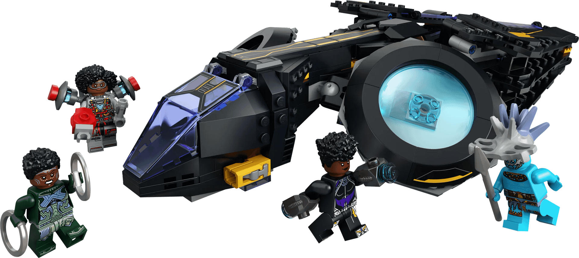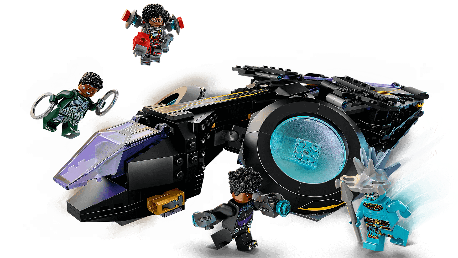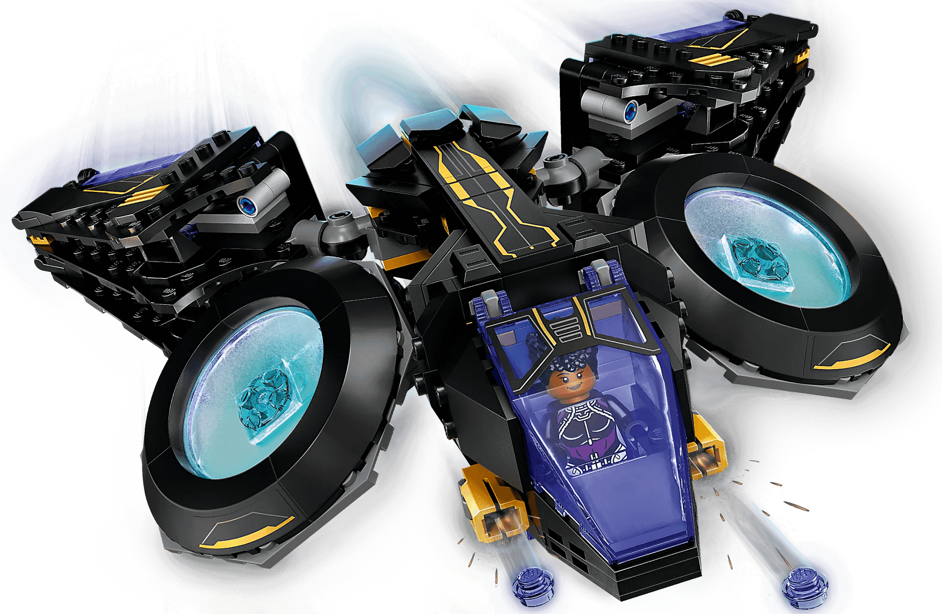 - 4 characters – Includes Shuri, Ironheart MK1, Nakia and Attuma minifigures, plus a spear, fighting rings and jetpack. The buildable Sunbird includes 2 stud shooters, rotatable engines and foldable wings