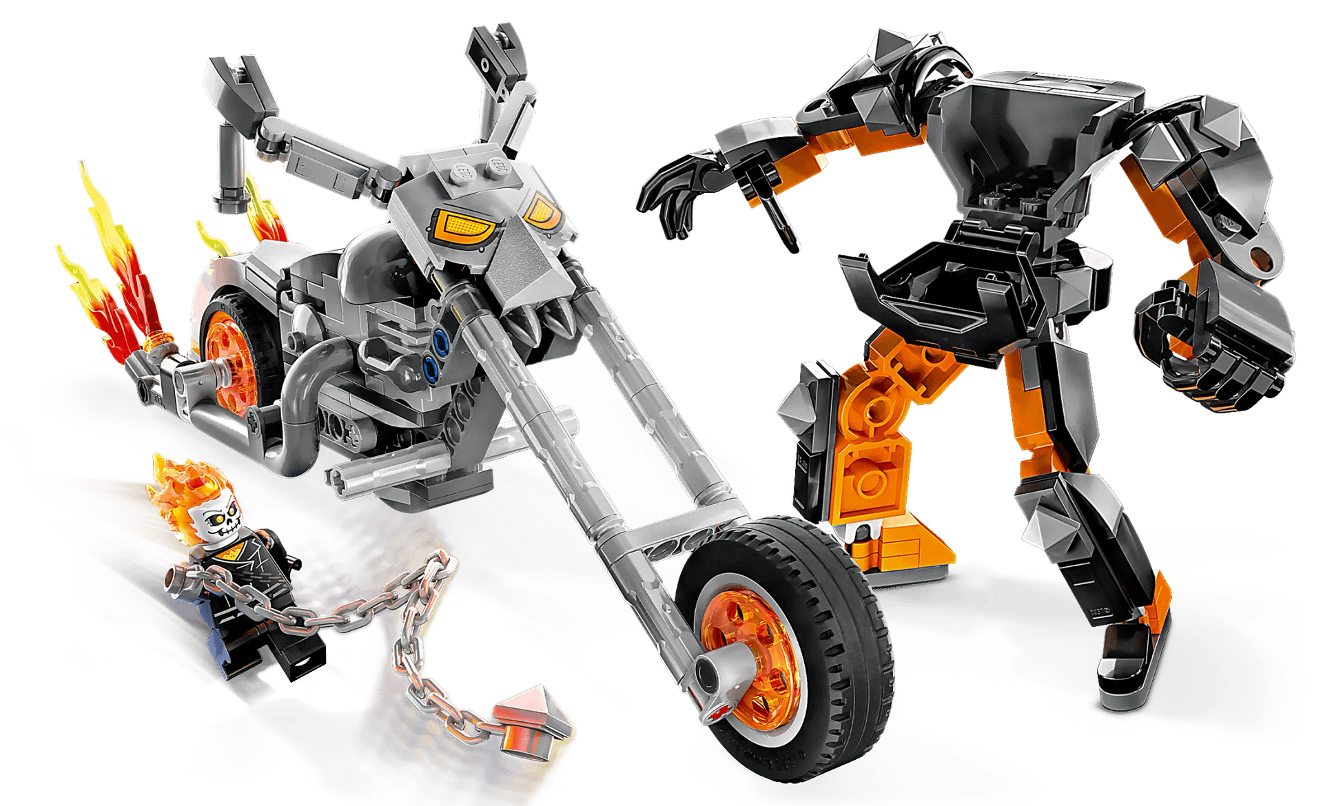 - Iconic character – Includes a Ghost Rider minifigure, a buildable Ghost Rider mech with fully jointed arms, legs and fingers, and a scaled-up motorcycle to which the mech attaches