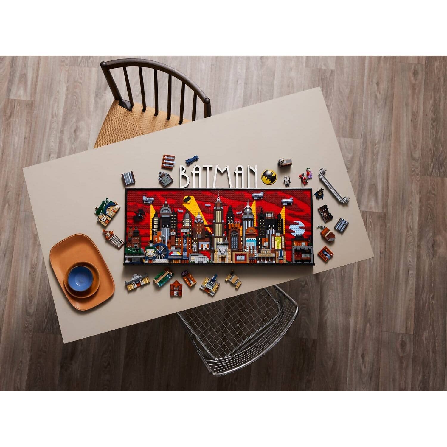 This 4,210-piece buildable GOTHAM CITY backdrop measures over 76 cm (30 in.) wide. It incorporates 15 panels that remove to reveal the inside of Wayne Manor, the Batcave™ and Arkham Asylum, and the activities of numerous villains from Batman: The Animated Series. The set also includes 4 minifigures – Batman, The Joker™, Harley Quinn™ and Catwoman™ – and a removable Batmobile™ and Batwing™. The assembled model can be mounted on a wall or stood on a surface using a flip-out stand. The 2 sets of included building instructions allow 2 people to work on the model simultaneously. For added convenience, a digital version of the set’s building instructions can be found on the LEGO Builder app.
