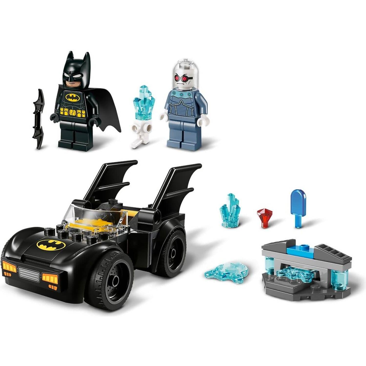 The set includes Mr. Freeze and Batman minifigures, plus a buildable Batmobile that has room for the Batman minifigure to sit inside. Kids can launch ice elements from a shooter that has a hole in the top to hold Mr. Freeze´s ice blaster or his popsicle. 2 ice diamonds can be attached to various places on the Batmobile, so kids can decide where Mr. Freeze ’freezes’ the Batmobile.