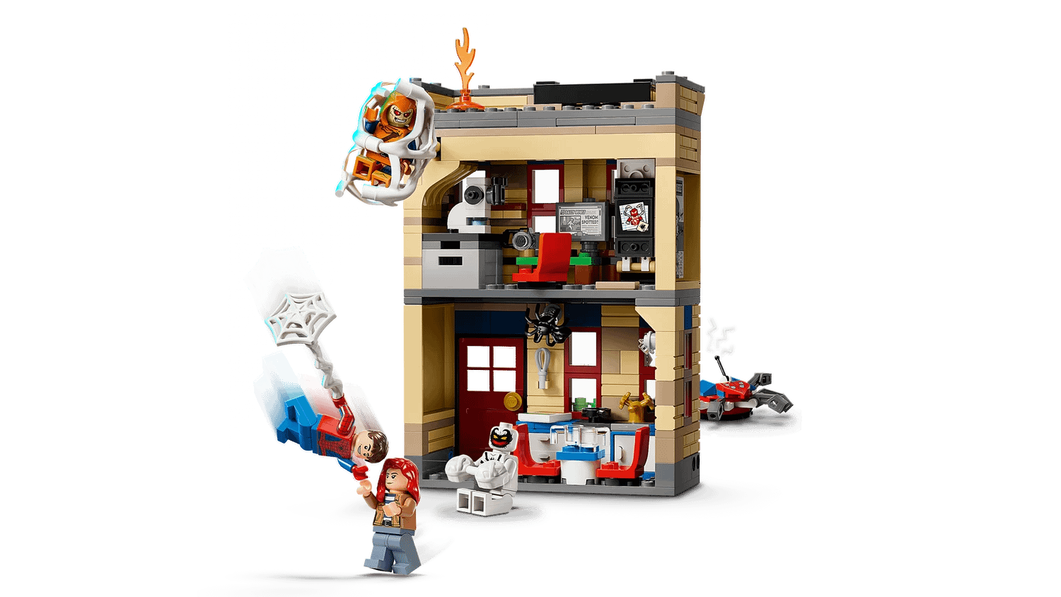 - LEGO® ǀ Marvel Spider-Man accessories – The 2-level apartment contains a kitchen, study and bedroom and features a giant, flexible, minifigure-trapping web attached to the outside of the building