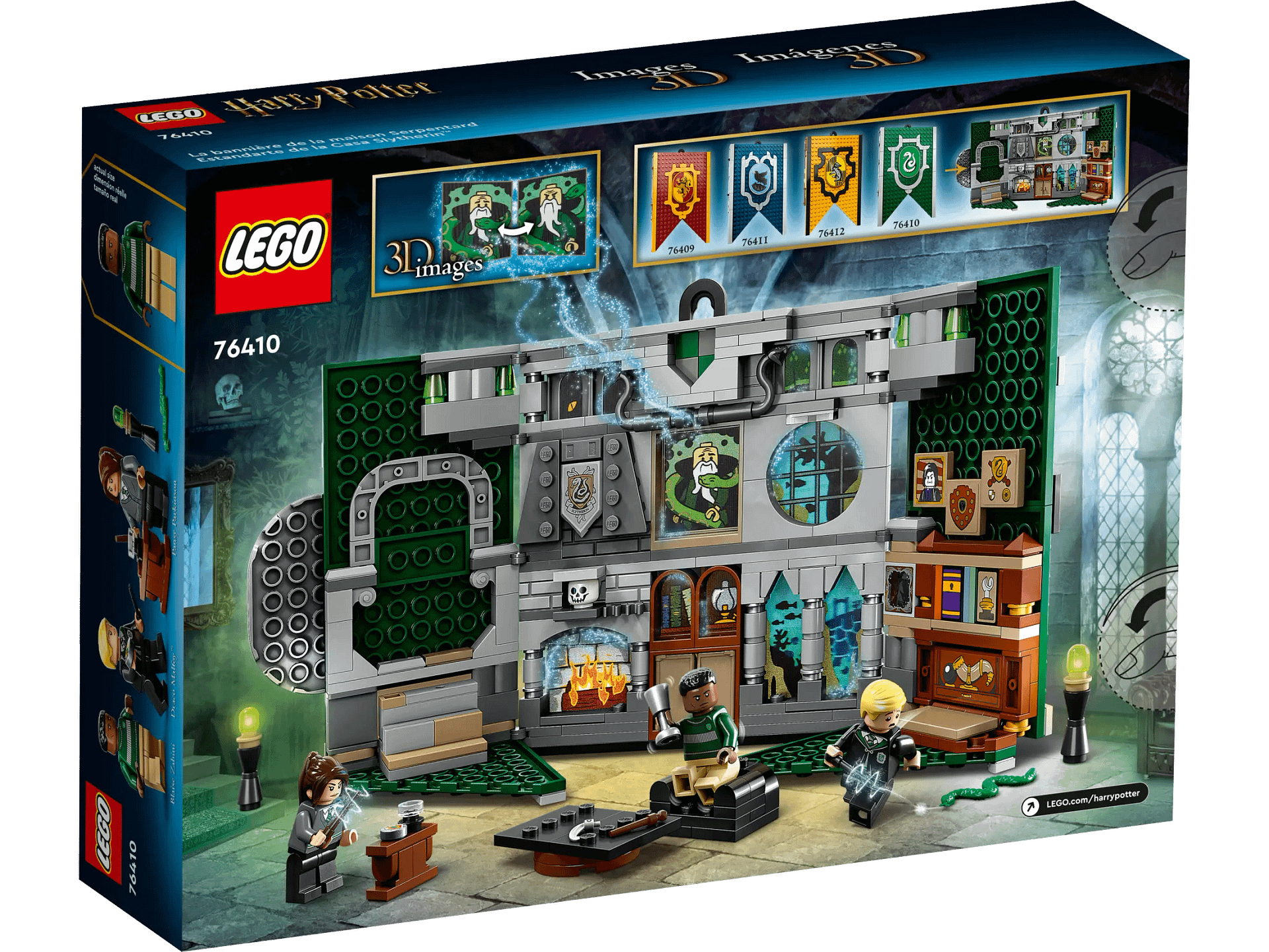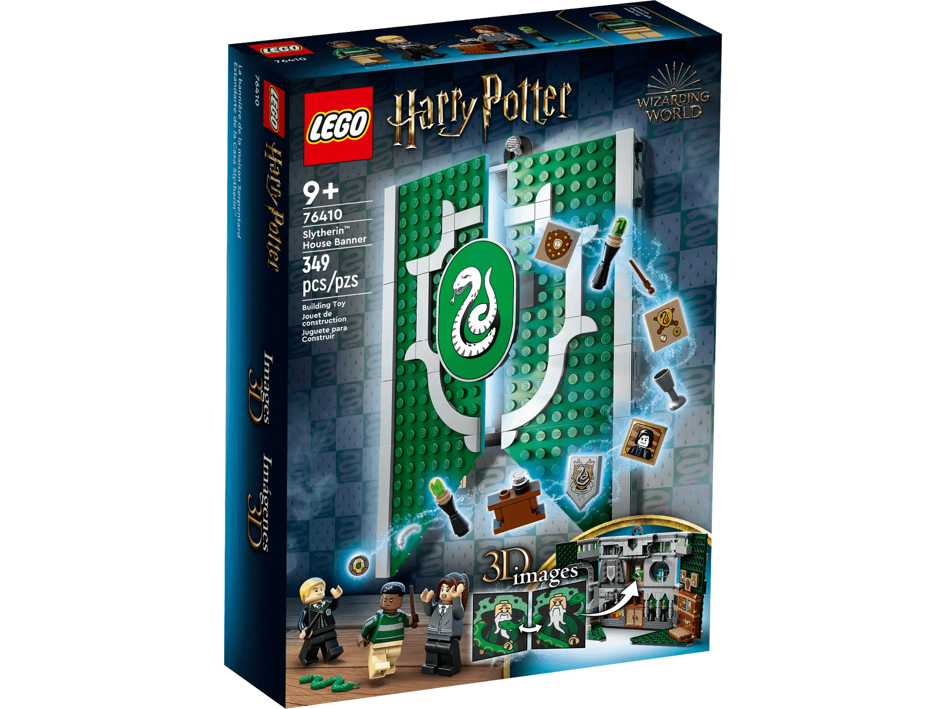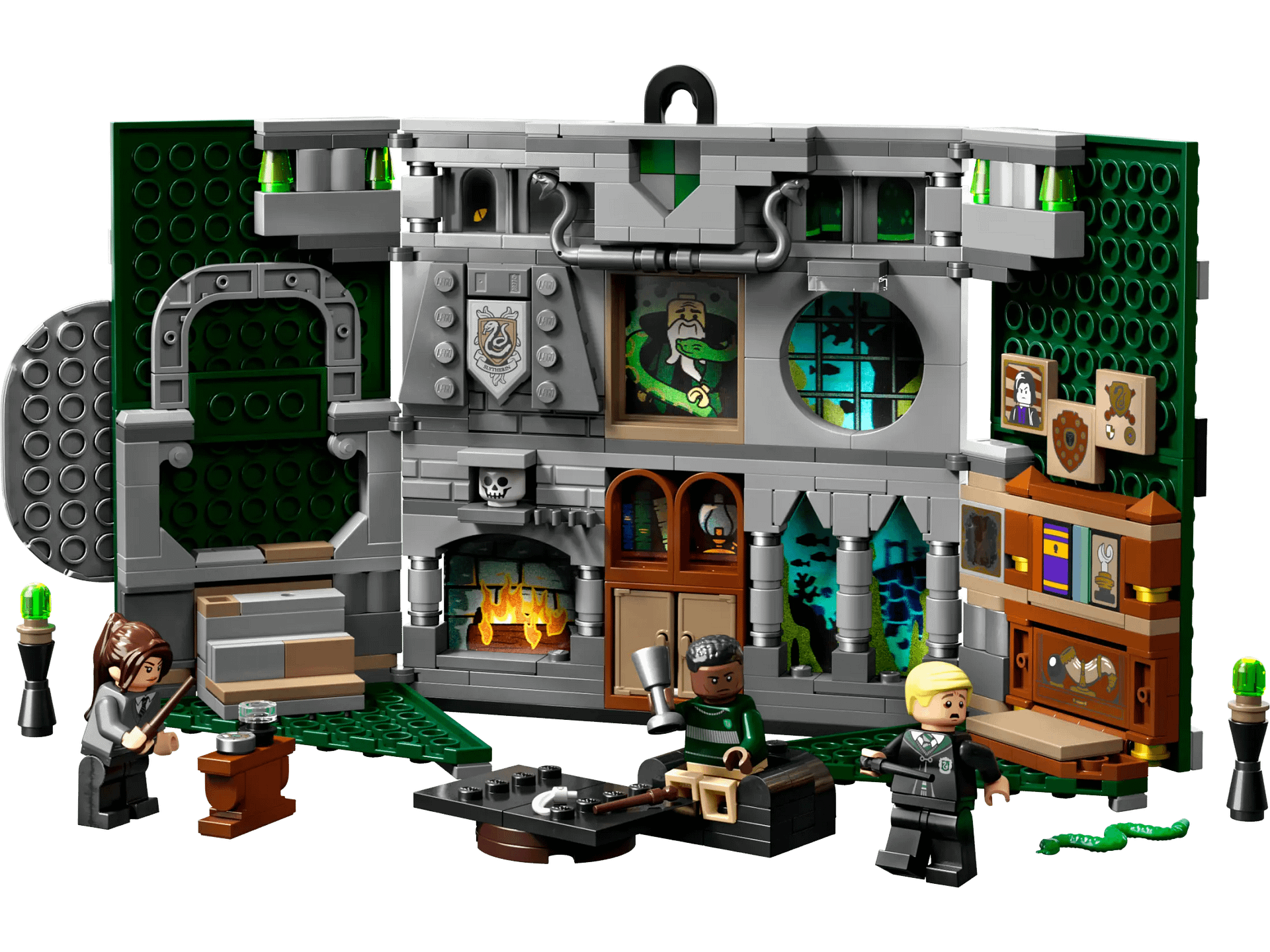 - LEGO® Harry Potter™ Slytherin™ House Banner (76410) – Kids can show their allegiance to Slytherin with this buildable banner. Hang it up or open it for play in the detailed common room