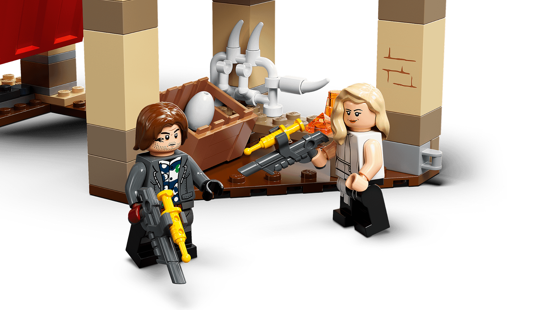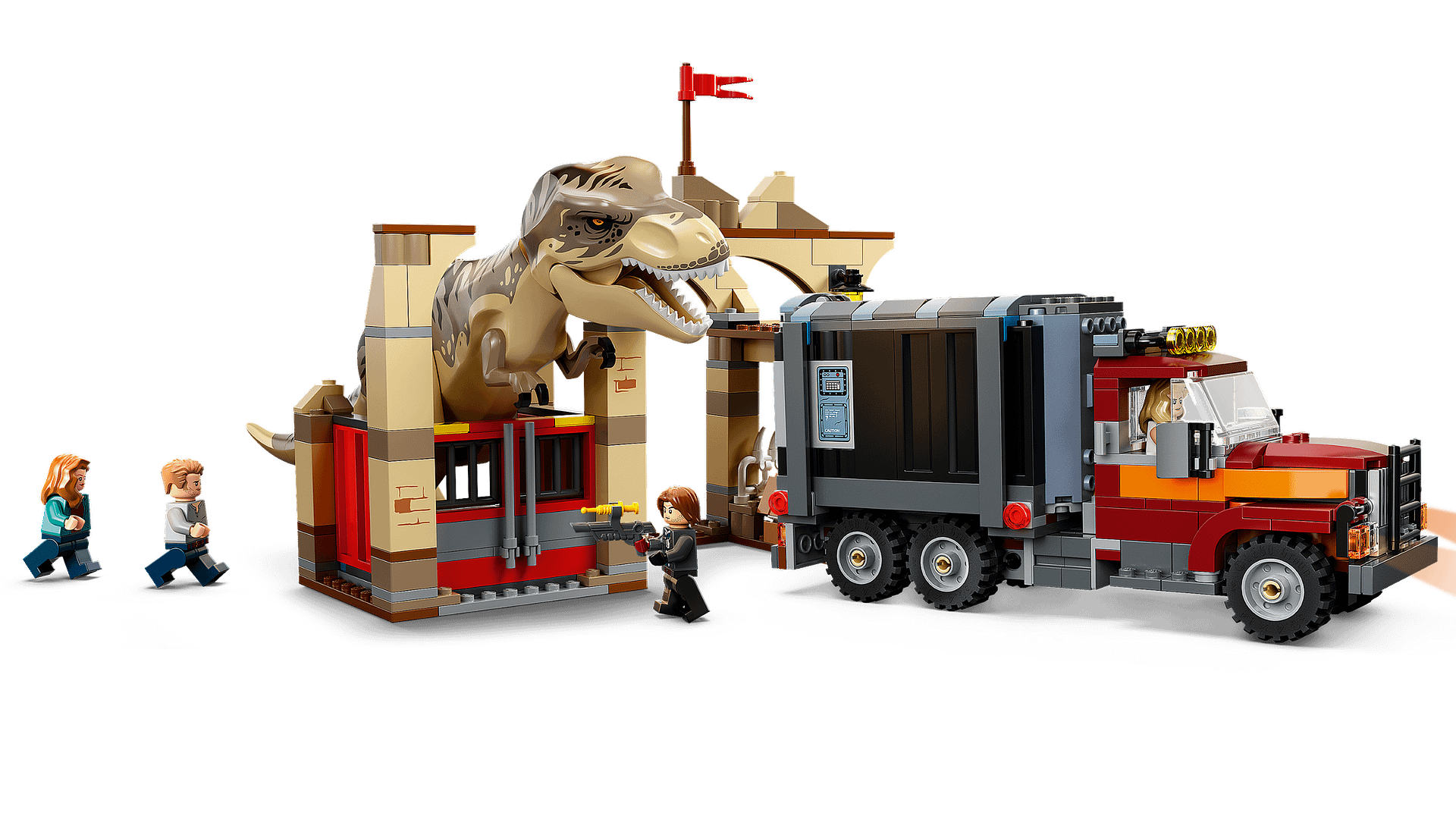 - 4 minifigures and 2 dinosaurs – Owen Grady, Rainn Delacourt and Soyona Santos, each with tranquilliser elements, and Claire Dearing, plus a T. rex standing over 4 in. (11 cm) tall, and an Atrociraptor
