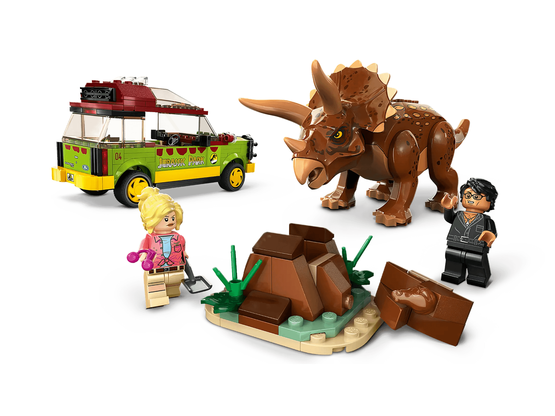 - Toy dinosaur and 2 minifigures – A posable Triceratops figure, plus Ian Malcolm and Dr. Ellie Sattler with a shovel element to scoop the hidden toxic berry element from the buildable dinosaur poop