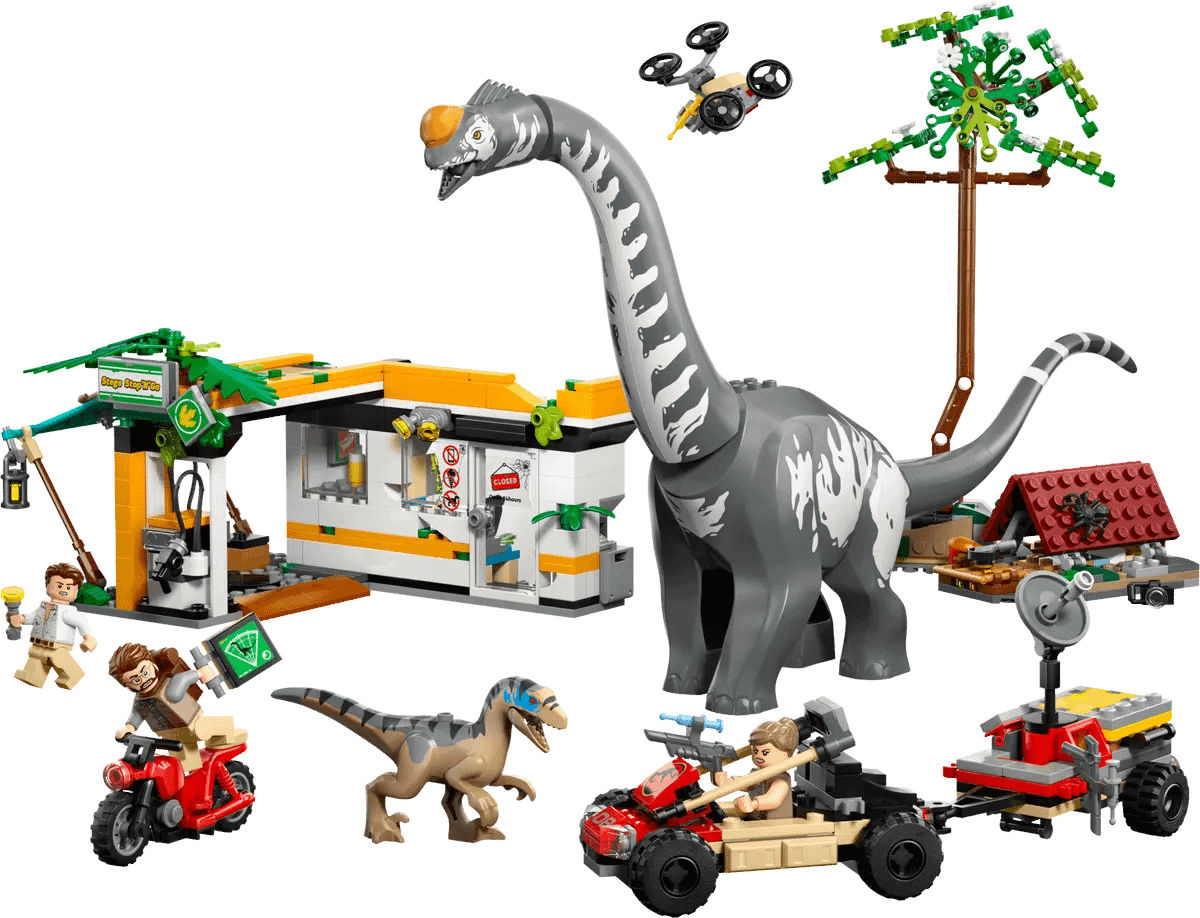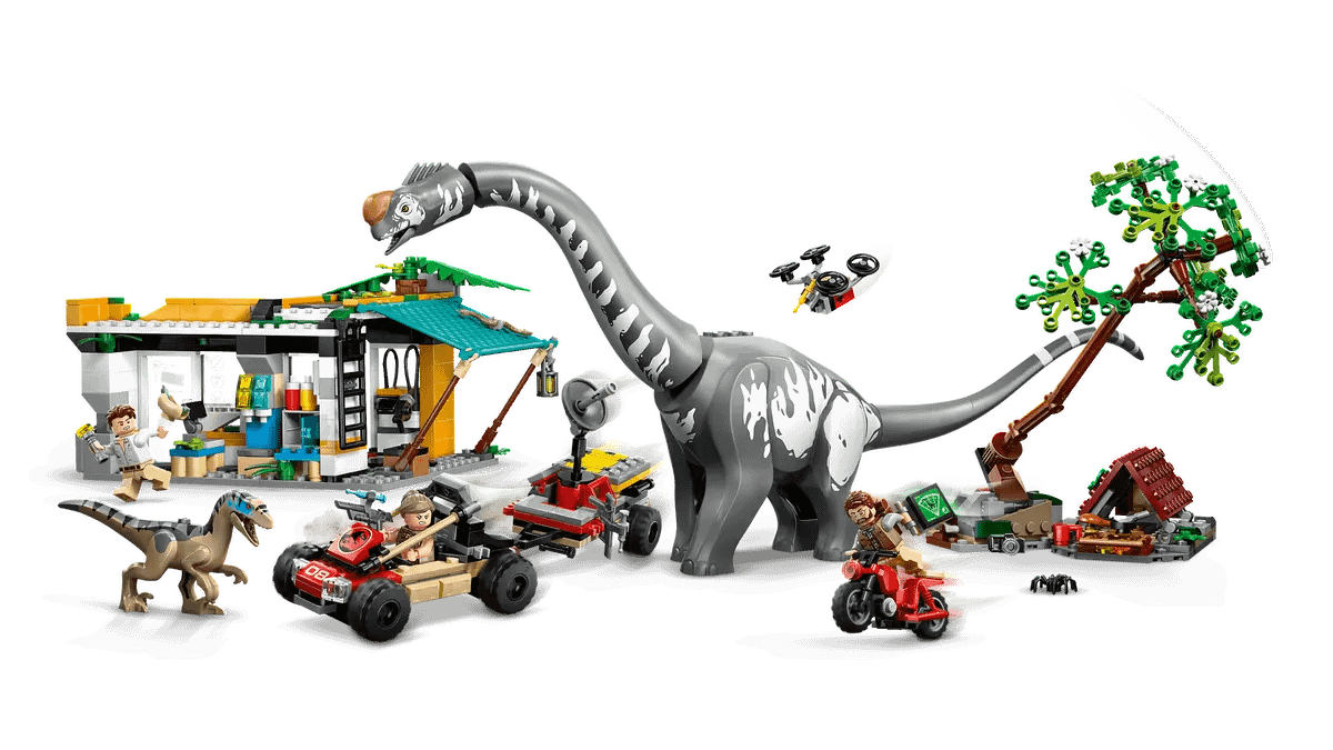 - Creative functions – The set includes a falling tree, a drone that attaches to the toy vehicle or the station roof, a Velociraptor with opening jaw and Titanosaurus with movable head, neck and tail