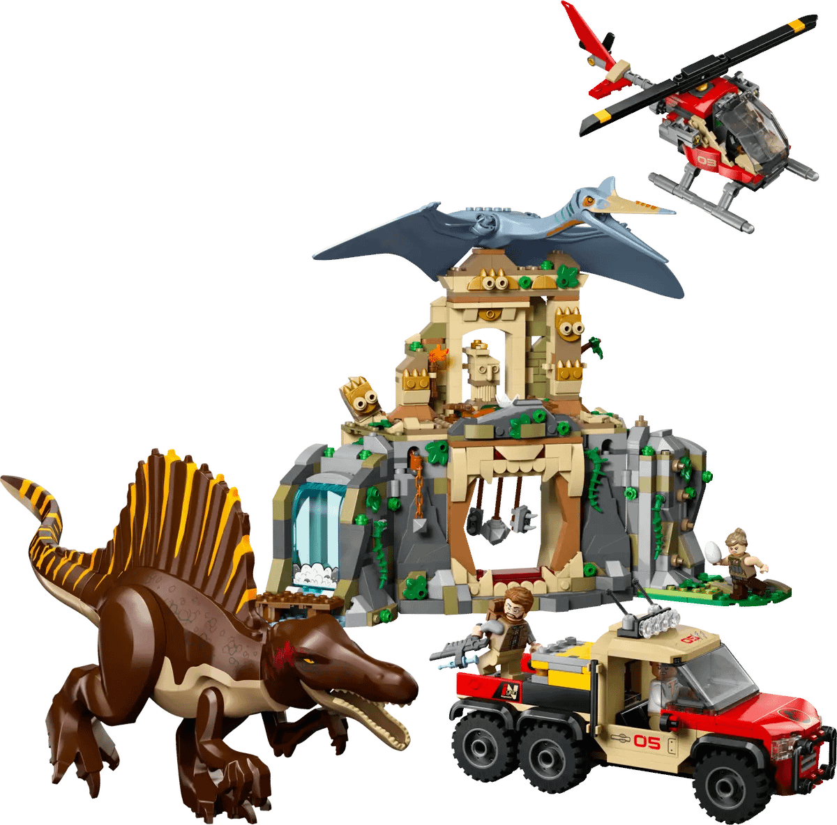 - Jurassic World Rebirth toys in a LEGO® box – Molded Spinosaurus and Quetzalcoatlus figures, 4 movie character minifigures, an ancient temple, a toy helicopter and dinosaur truck toy, plus lots of details