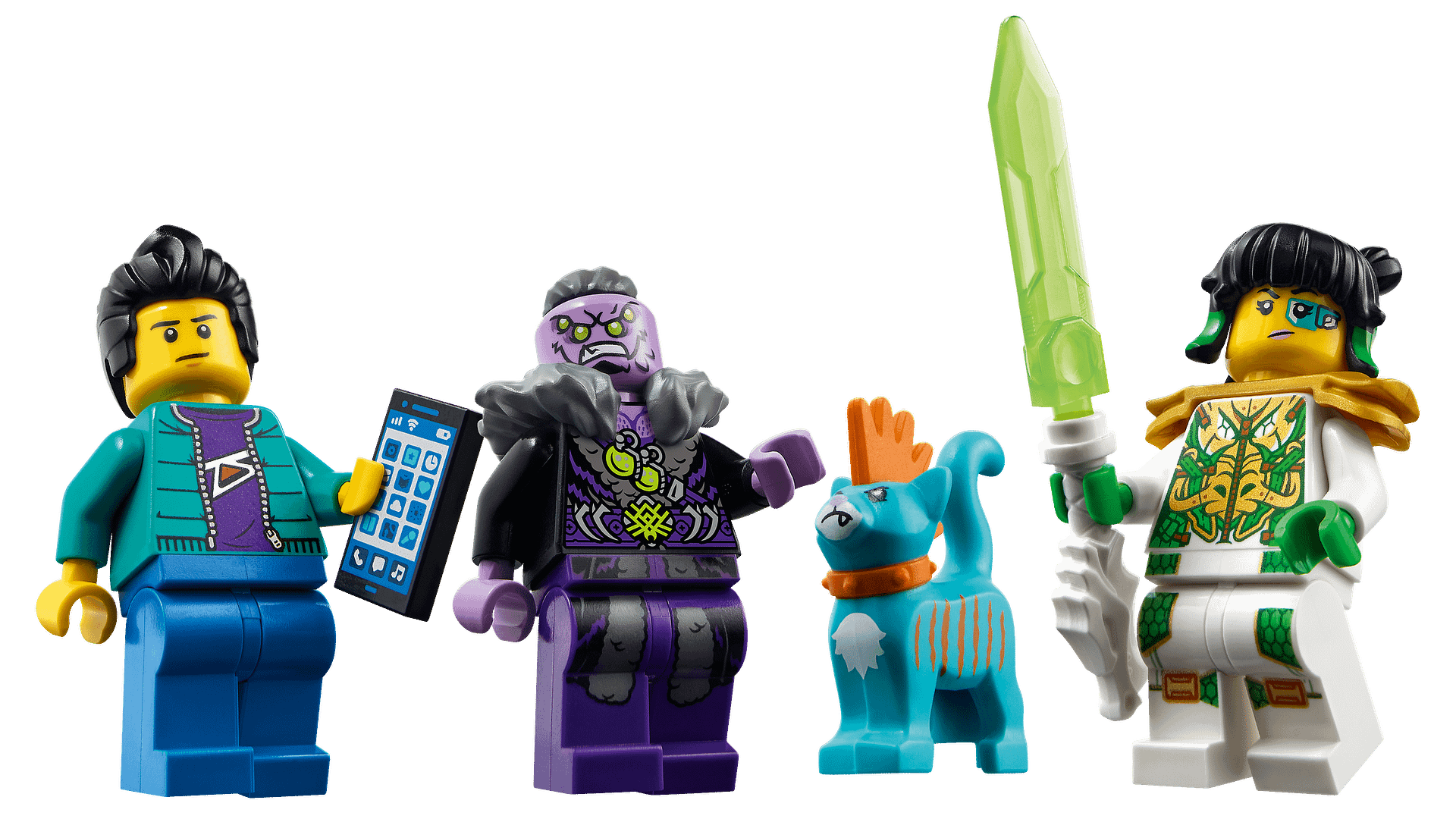 - This LEGO jet plane playset includes 3 minifigures – Mei, Huntsman and Si – with weapons including Meis Jade Dragon Blade, plus a Mo the cat figure with a buildable, stud-shooting hoverboard.
