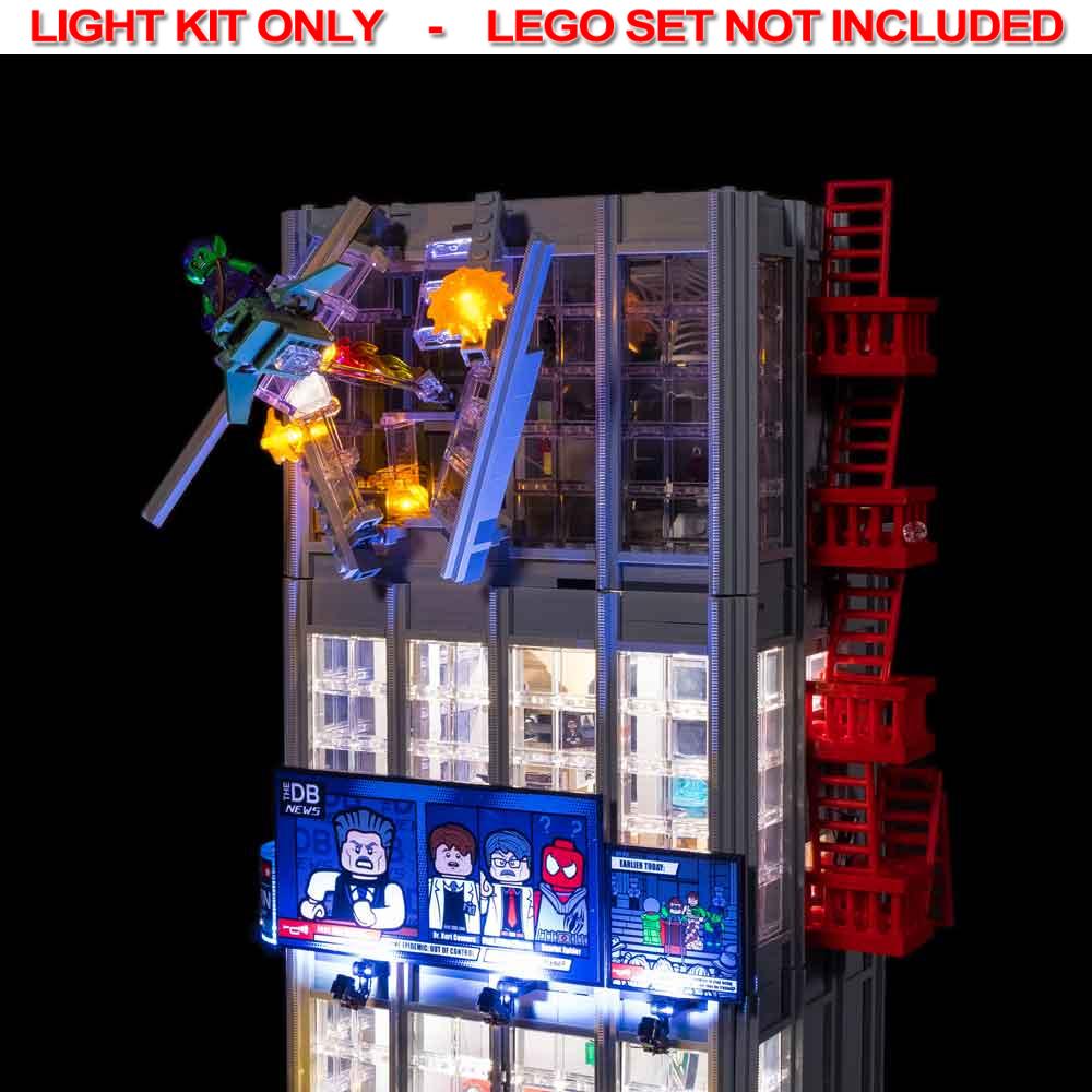 With not one, two or three - but four gigantic levels to explore, the Light My Bricks light kit will light the way! Featuring an equally gigantic count of 56 individual LEDs! Including regular, micro and flashing bit lights, as well as enough spotlights to see the iconic Daily Bugle sign and billboard from way outside the Spiderverse! Flickering effects highlight the Green Goblin's window smashing entrance and Firestar’s explosive rooftop exit!