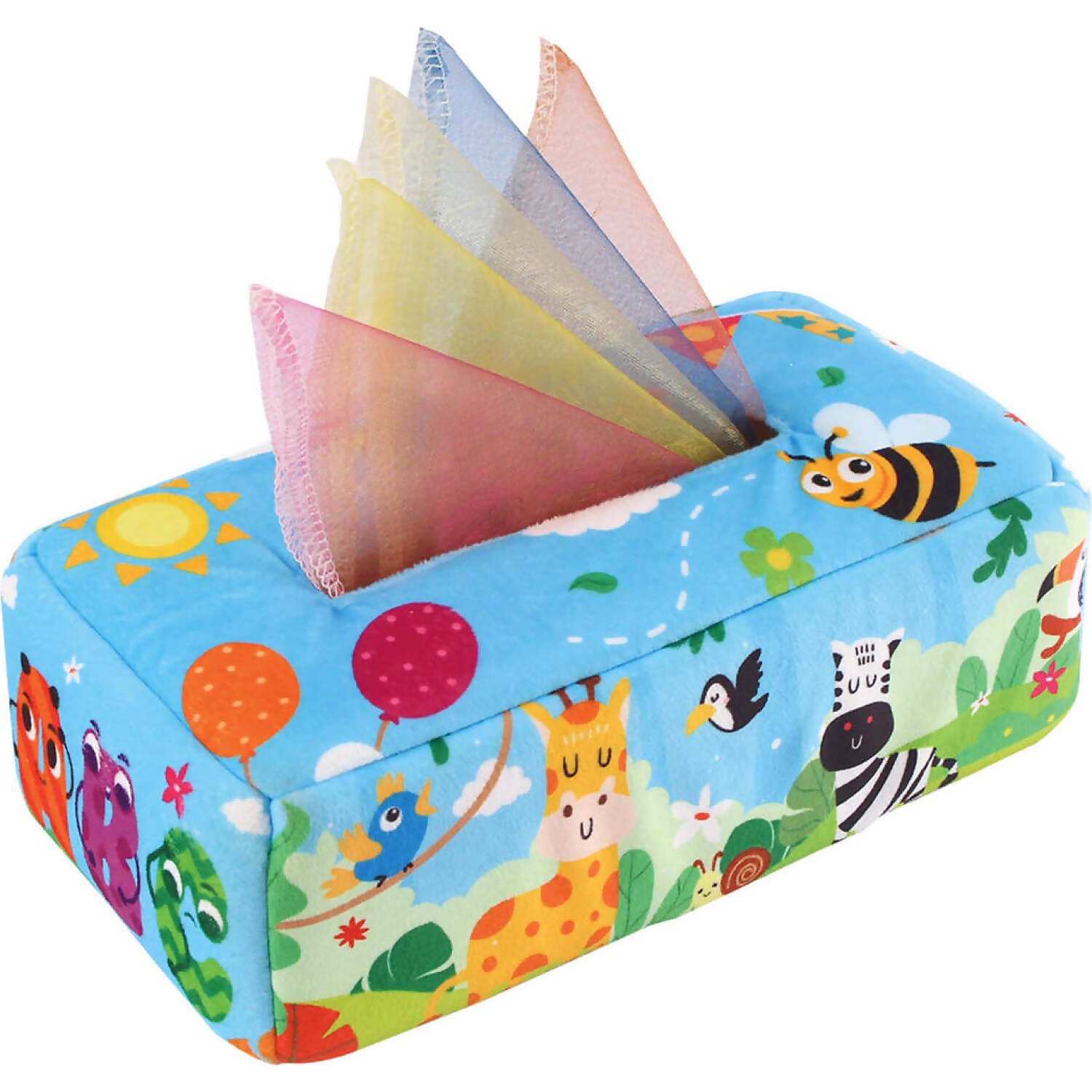 But that's not all; our tissue box toy comes fully equipped with 13 multi-themed crinkle papers and 8 colorful silk scarves, providing endless opportunities for exploration and discovery. With vibrant colors, crinkly sounds, and pull-along fun, this toy engages young minds and helps foster problem-solving skills a color-sorting abilities; all while having a blast!
