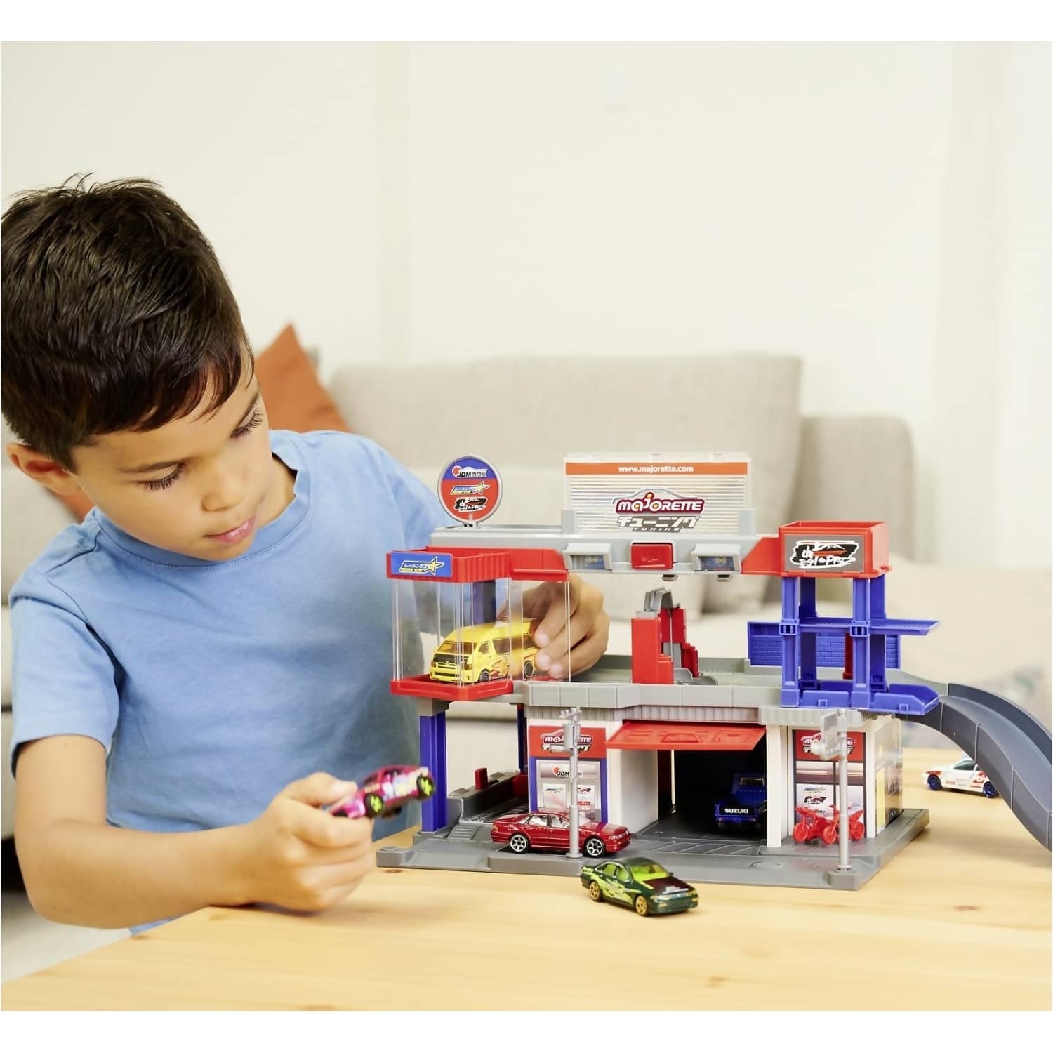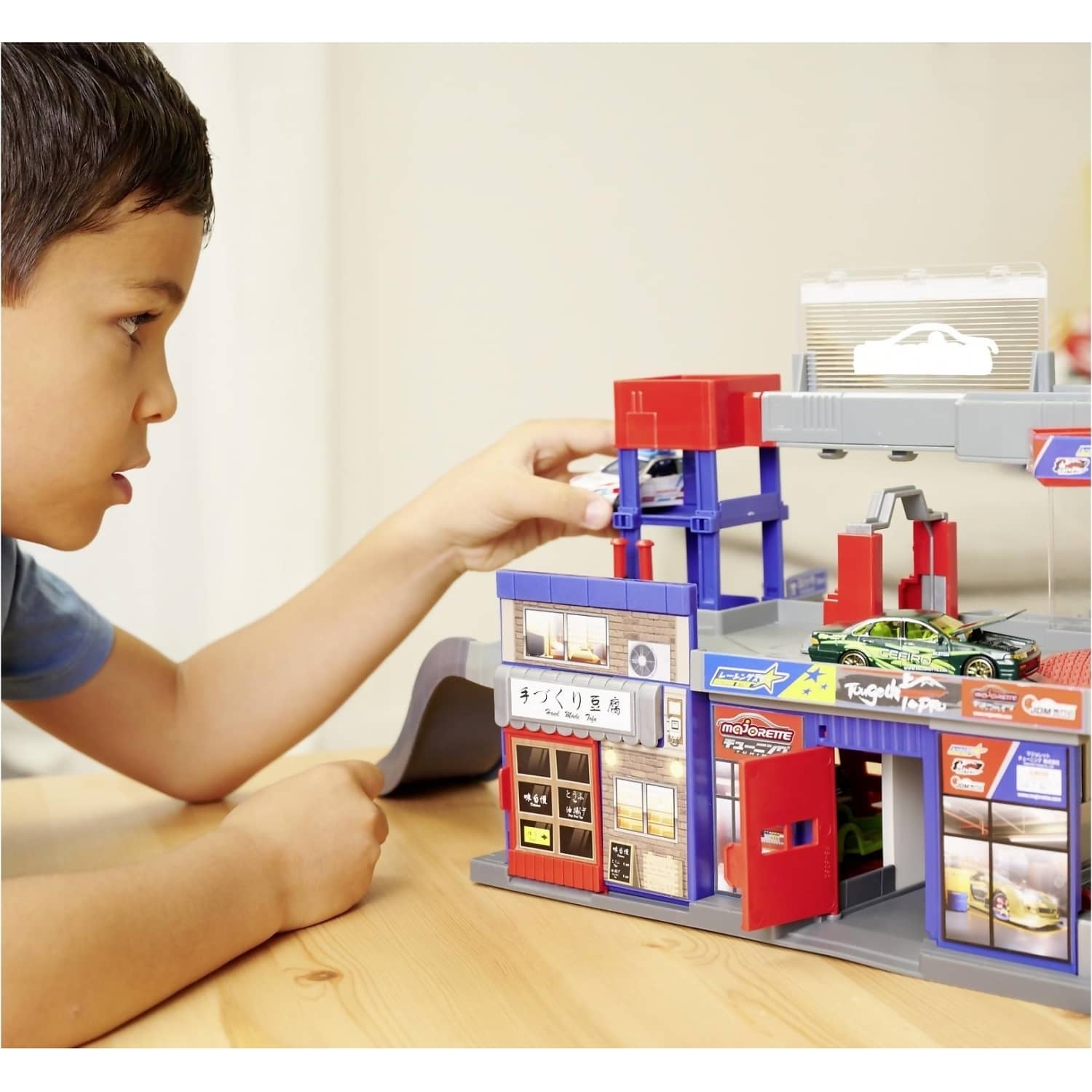 The parking garage is designed to match the Japan Series vehicles from the Majorette Deluxe range