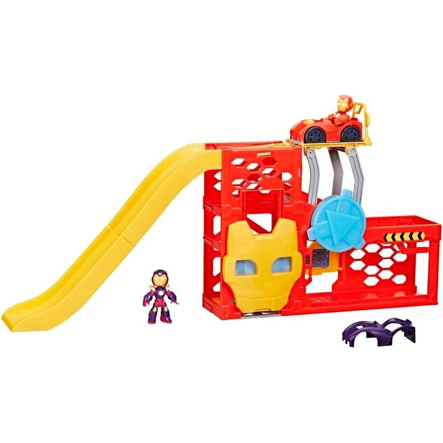Kids can suit up and race into action with the Marvel - Iron Man And His Awesome Friends Iron Garage Playset, inspired by the Disney Jr. series. This dynamic playset features a working Iron Man helmet elevator, a rotating arc reactor lift, and a race ramp that launches vehicles into heroic missions. With interactive elements and imaginative design, children can recreate thrilling adventures alongside Iron Man and Ironheart.