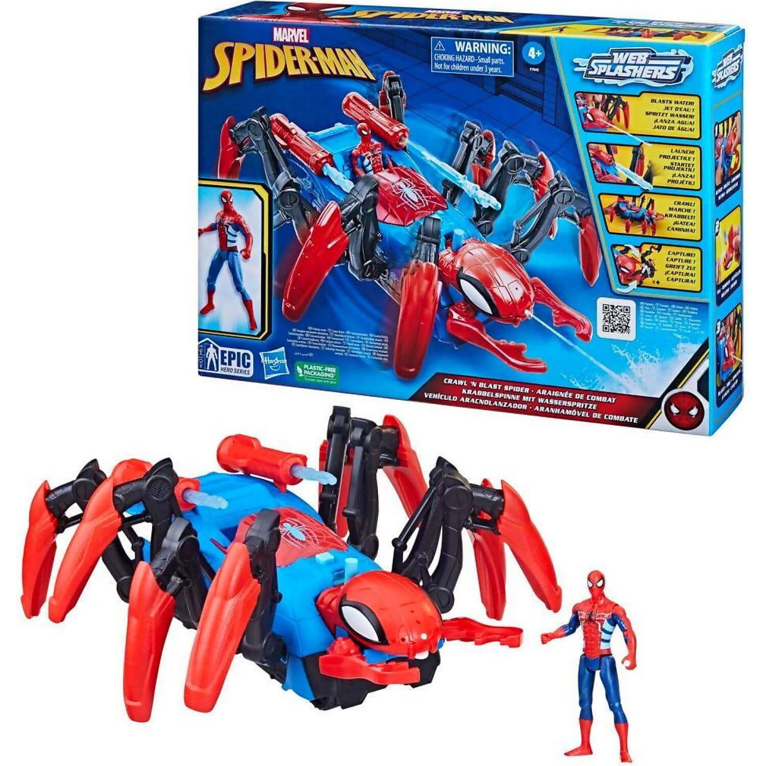 This set includes a 4-inch articulated Spider-Man figure that can be placed into the Crawl 'N Blast Spider. Designed for kids aged 4 and up, the Spider’s head can be detached and filled with water to activate a thrilling water blast feature at the push of a button!