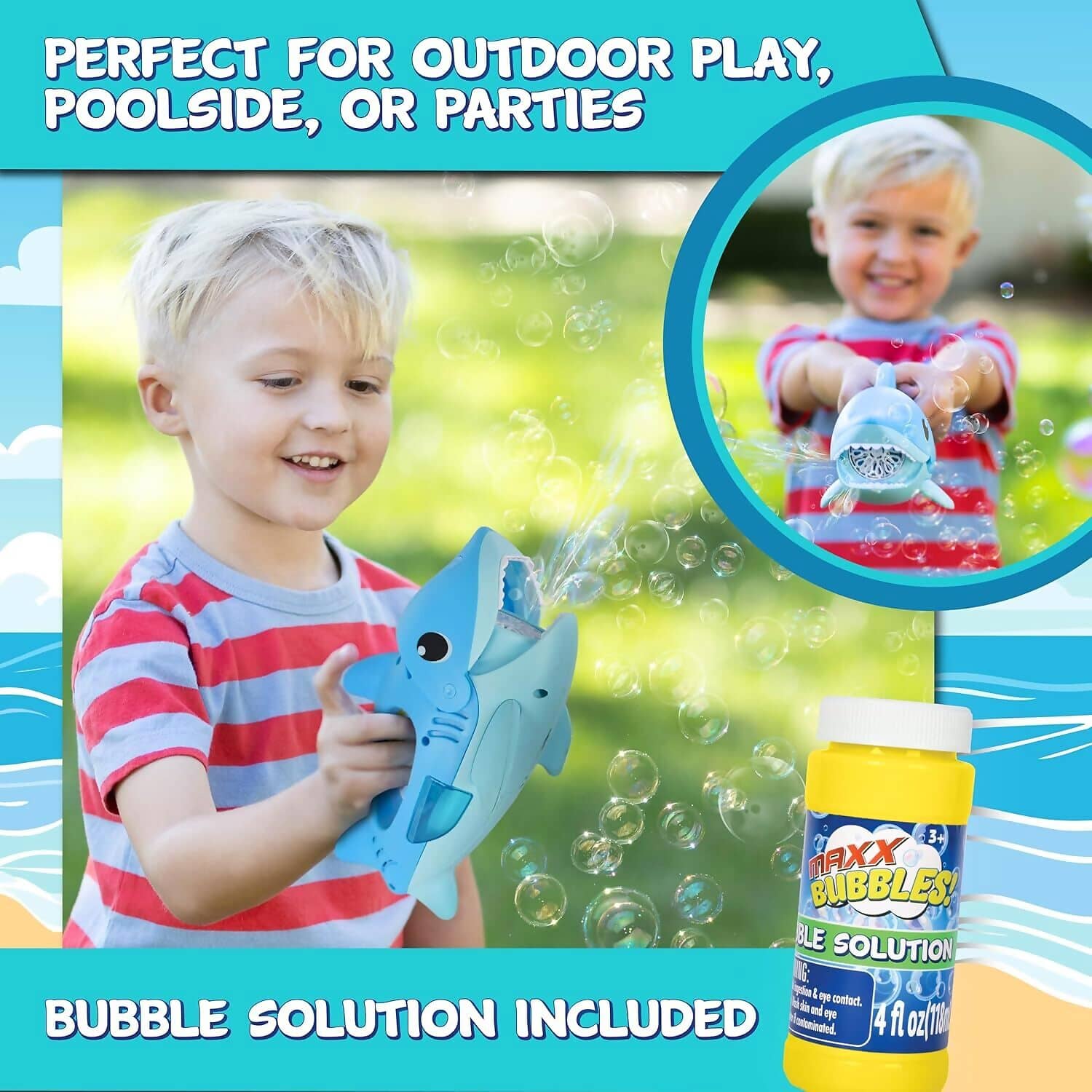 Unleash a tidal wave of fun with the Maxx Bubbles! - Shark Bubbler, a playful sea creature that transforms outdoor play into a bubbly adventure. With a friendly grin and vibrant design, this handheld shark springs to life with every squeeze, releasing a stream of magical bubbles. Accompanied by cheerful music, it’s the perfect companion for sunny days in the garden, at the beach, or poolside.