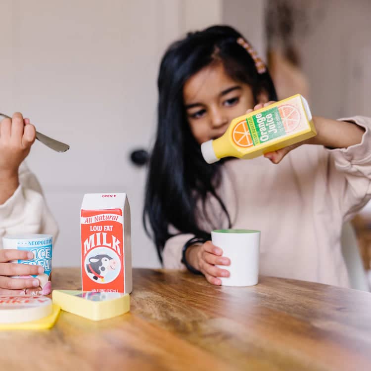 Fridge Food Set - Wooden Play Food unpack these 'chilled' wooden groceries into your play fridge and freezer for really 'cool' food play! Perfect for make-believe or as novel manipulatives for counting, sorting and more. Nine wooden pieces include orange juice, waffles, milk, ice cream, cheese, yogurt, bologna, frozen vegetables, and butter.