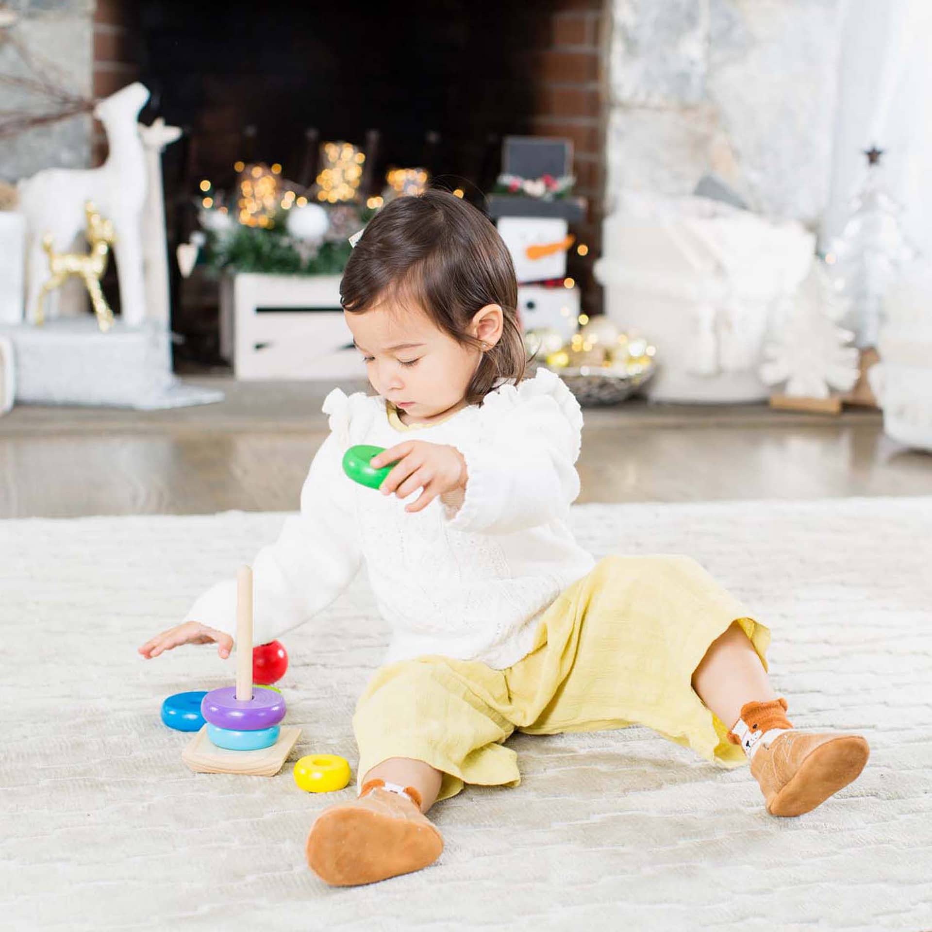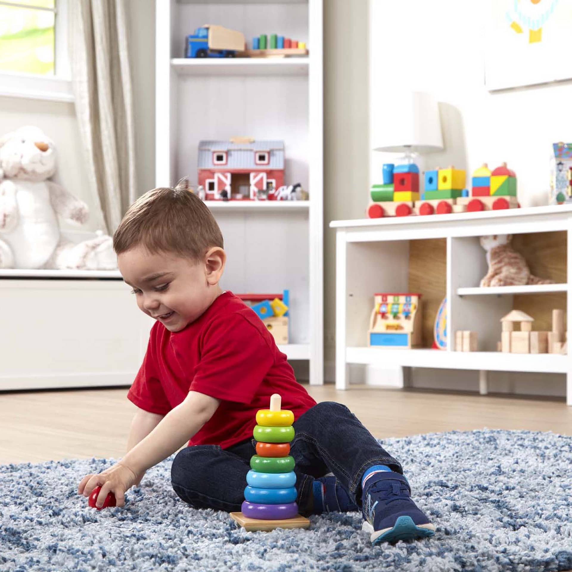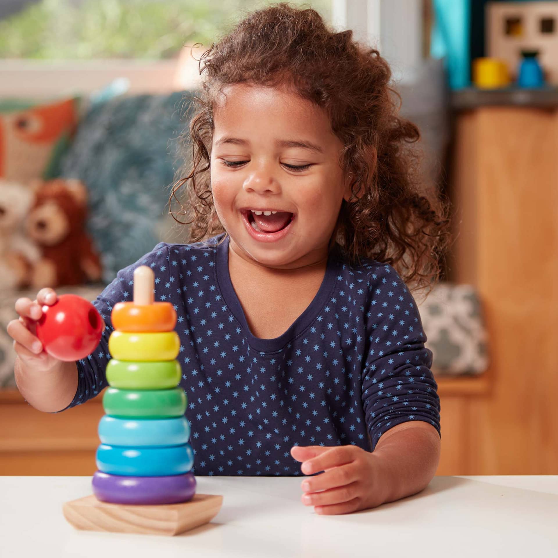 Talk about a classic childhood toy! All the colours of the rainbow are represented by these eight smooth, easy-grasp wooden pieces. Stack them on the solid-wood base, designed with rocking edges for safe and intriguing play.