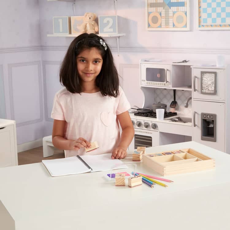 When your little princess is ready to have a ball, she will love designing her own royal adventures with this exquisitely detailed stamp set. A two-color stamp pad, five colored pencils and 9 fabulously regal stamps are all packed in a sturdy wooden tray.