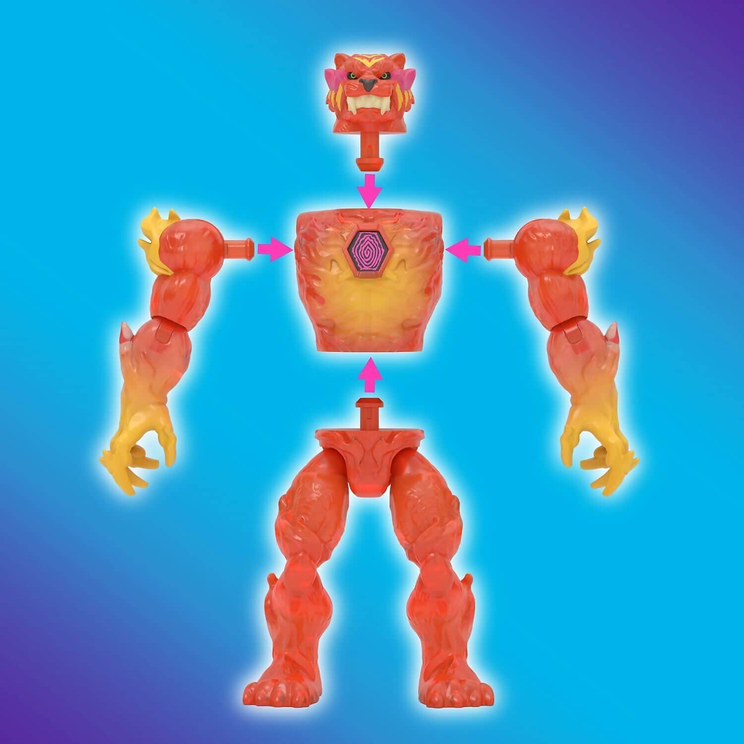 The experiment begins with the MrBeast Lab vessel—twist and crack open the lid to reveal a massive strip of 13 sealed foil bags. Rip them open to uncover individual beast parts to create five 4 inches (10.16 cm) tall epic action figures, including the Mega Torso Panther. Place the Super Hybrid figure into the vessel and adding water. Pour, swirl and reveal your Hybrid's true color.
