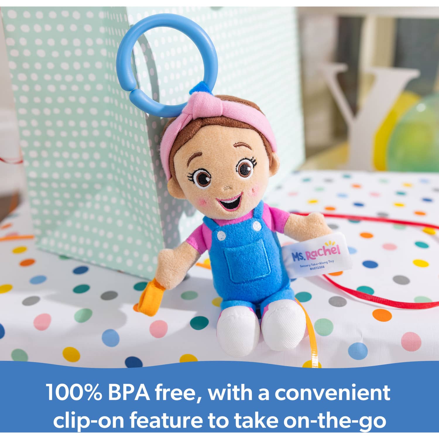 Clip it to baby’s stroller, diaper bag, car seat, or other gear for on-the-go fun, as part of your staple travel toys and baby teething toys for baby boy and baby girl toys like Miss Rachel dolls.